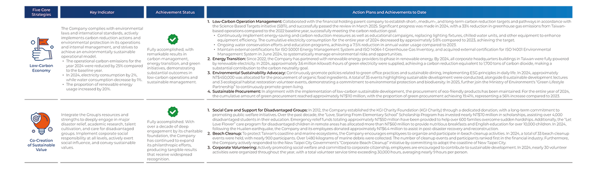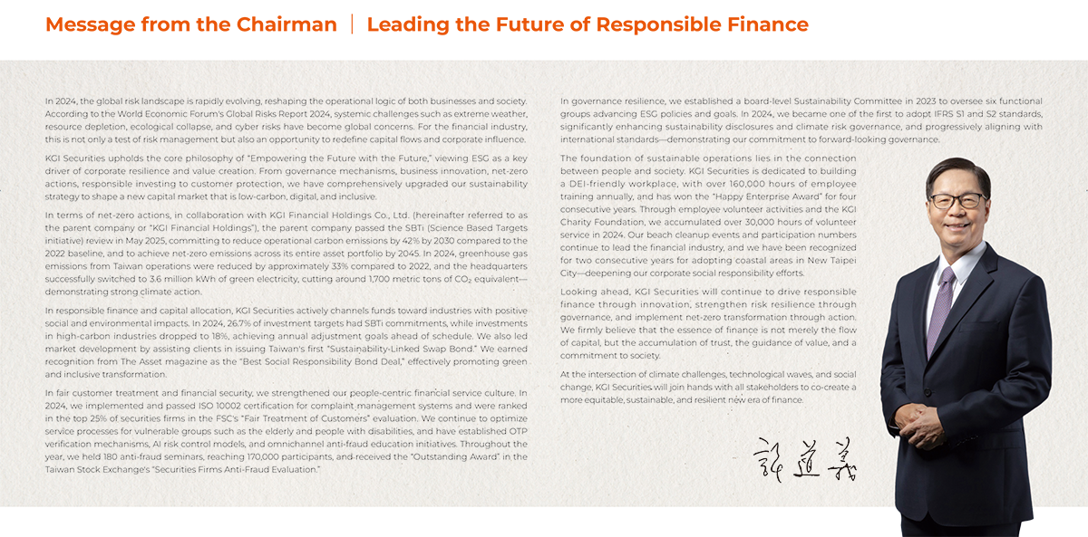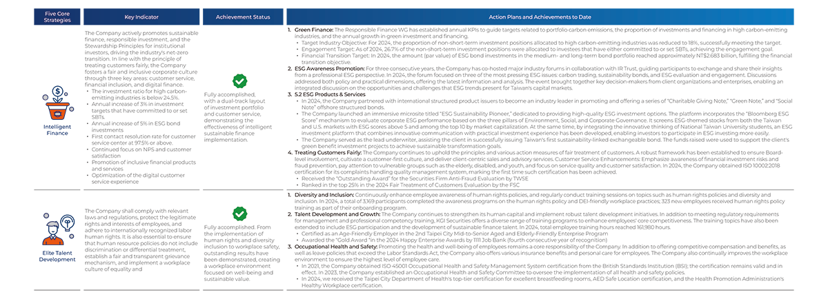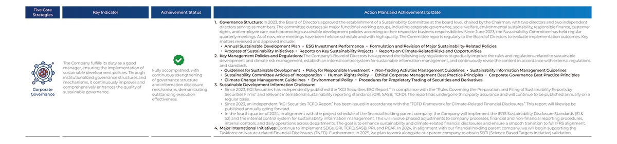 The Company actively implements “Green Finance,” the “Implementation Strategy for the Sustainable Development of the Securities and Futures Companies,” and other sustainability finance related policies, in alignment with the KGI Financial Group's five core ESG strategies: “Corporate Governance,” “Intelligent Finance,” “Elite Talent Development,” “Low-Carbon Economy,” and “Co-creating Sustainable Value.” The “Guidelines for Sustainable Development” have been established, committing KGI Financial to actively implement sustainable development in the course of business operations to align with global trends. Through our role as a responsible corporate citizen, we aim to contribute to the national economy, enhance the quality of life for employees, communities, and society, and cultivate a competitive edge rooted in sustainability. The Company has also engaged external experts to conduct risk analyses and assessments related to sustainability, ESG, and climate change. Together, we develop relevant policies and response strategies. To ensure transparency, we disclose our progress through the publication of ESG Reports and TCFD Reports, enabling stakeholders tomonitor KGI Securities' sustainable development. Our ESG achievements to date are summarized as follows: