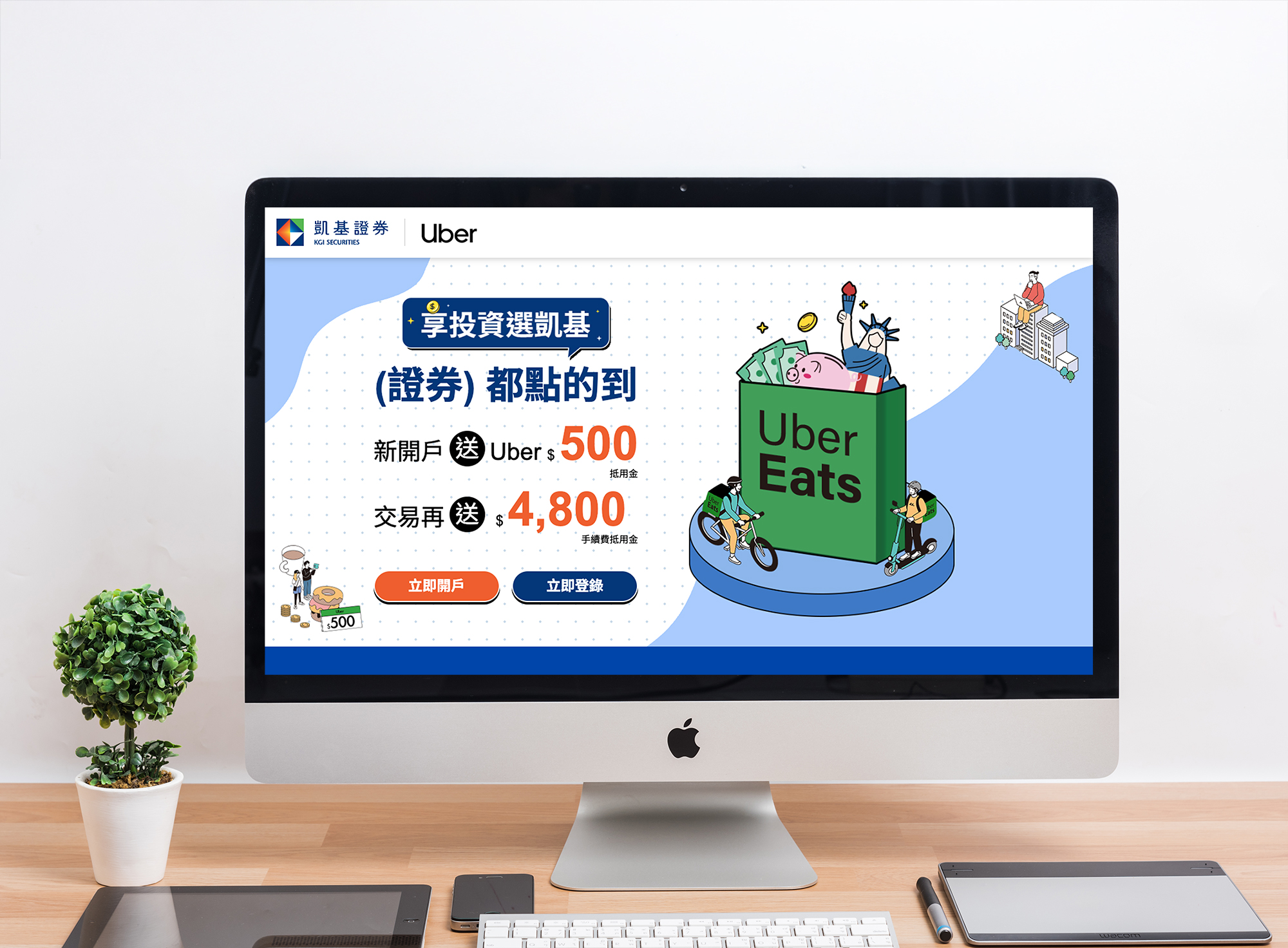 圖說:凱基證券推出「享投資選凱基」活動,新開戶即獲得Uber/Uber Eats雙享券抵用金500元,再享最高4,800元手續費抵用金。