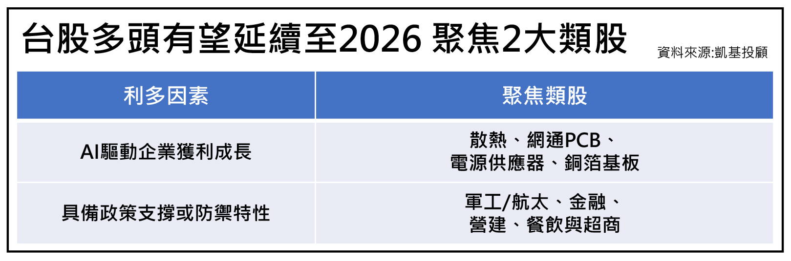 投資選股方面,凱基投顧建議投資人聚焦散熱、網通PCB、電源供應器、銅箔基板等具規格升級顯著的次族群,並在修正期間分批進場;另外,由於非AI股的基本面相對疲弱,整體需謹慎選股,建議可挑選具備政策支撐或防禦特性的產業,例如軍工/航太、金融、營建、餐飲與超商等。