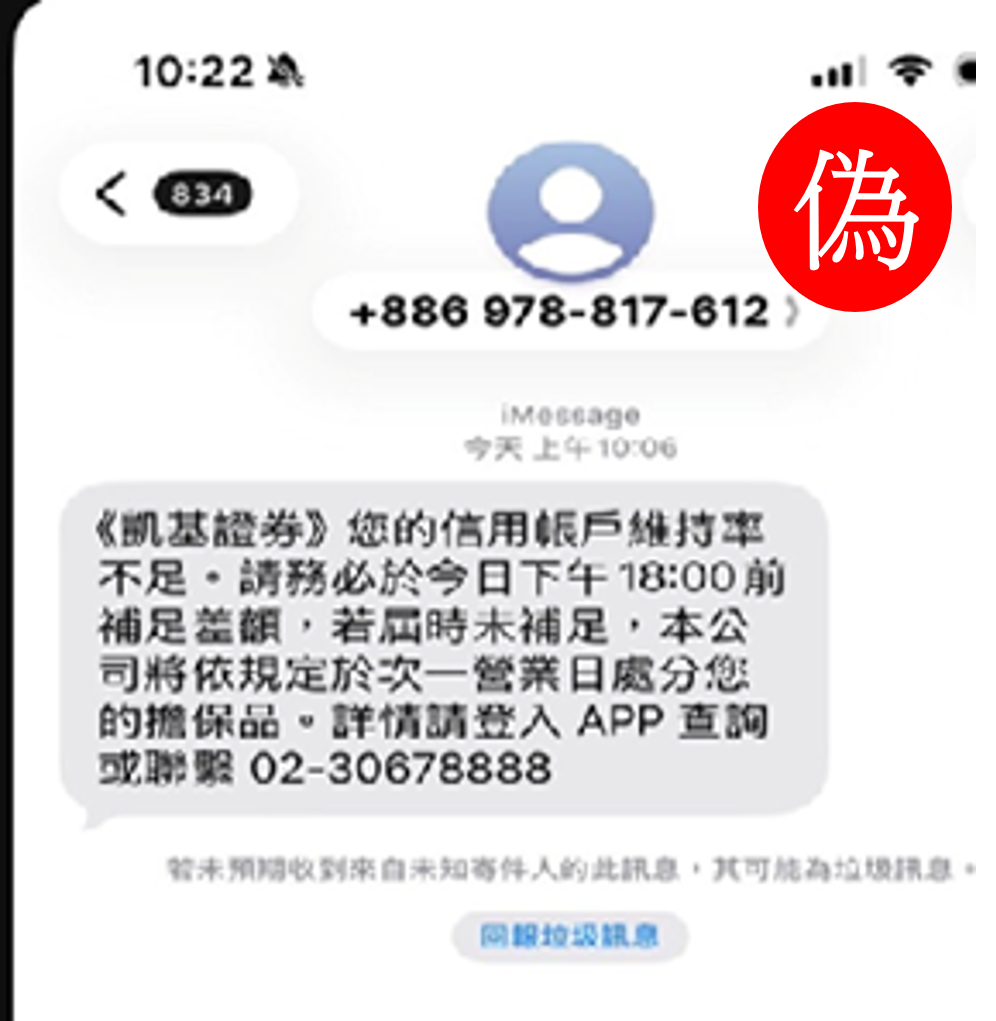 近日有不明人士發送簡訊假冒凱基證券名義,要求投資人「補足信用帳戶維持率」,並稱「如屆時未補足,將依規定於次一營業日處分您的擔保品」,內容並表示可登入APP或撥打特定電話查詢(如下圖)。特此澄清該內容屬冒用凱基證券名義之不實詐騙訊息。