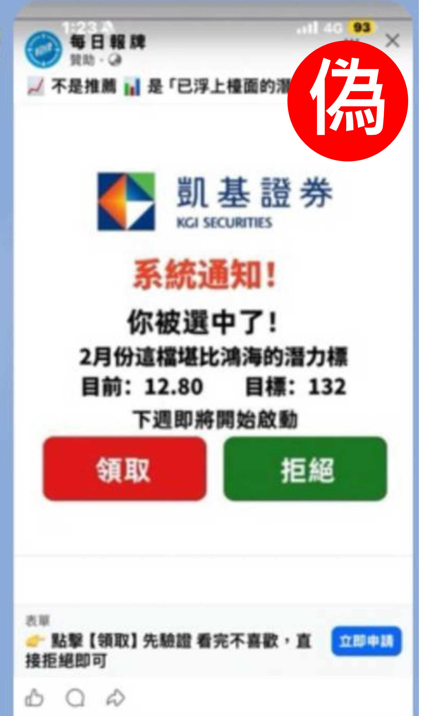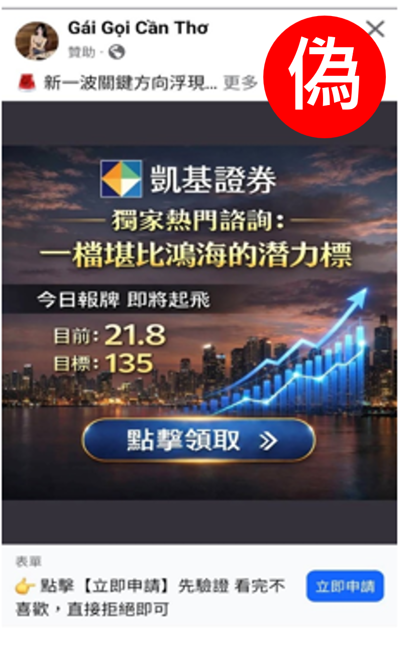【重要提醒】請提高警覺近期冒用凱基證券名義,於社群平台以明牌潛力股名單為號召誘使投資人點擊申請領取相關資料之詐騙訊息