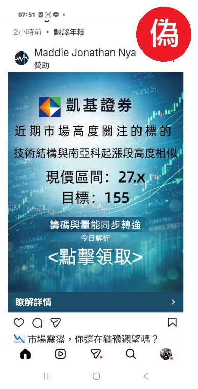 近來發現有不明人士盜用本公司商標並偽冒凱基證券名義,在社群媒體(如IG)平台發布「三檔明牌潛力股曝光」、「近期市場高度關注之標的,技術結構與南亞科起漲段高度相似」等不實訊息,藉此引誘客戶點擊連結以獲取進一步資料之情事(如下圖)。經查,前開訊息內容均屬不實詐騙,請勿輕信點擊以免上當。