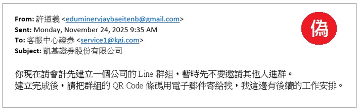 本公司客服中心近來接到不明人士冒用本公司董事長許道義、副董事長糜以雍名義寄發之email,表達先請會計建立一個公司的 Line 群組,暫時先不邀其他人入群,建立完成後,請把群組的 QR Code 條碼用電子郵件寄給發信人,其有後續的工作安排云云。該封email業經本公司辨識確認為詐騙信件。
