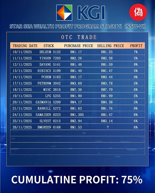 近來有不明人士未經同意使用本公司商標並偽冒凱基證券名義,散佈「KGI – 星海財富盈利計劃第六階段 (Star Sea Wealth Profit Program Stage VI (SSW-VI))」之貼圖訊息,介紹場外交易及利潤百分比(如下圖)。特此澄清本公司及轄下子公司均未推出前述計畫,相關訊息內容均屬不實詐騙,請勿輕信以免上當。