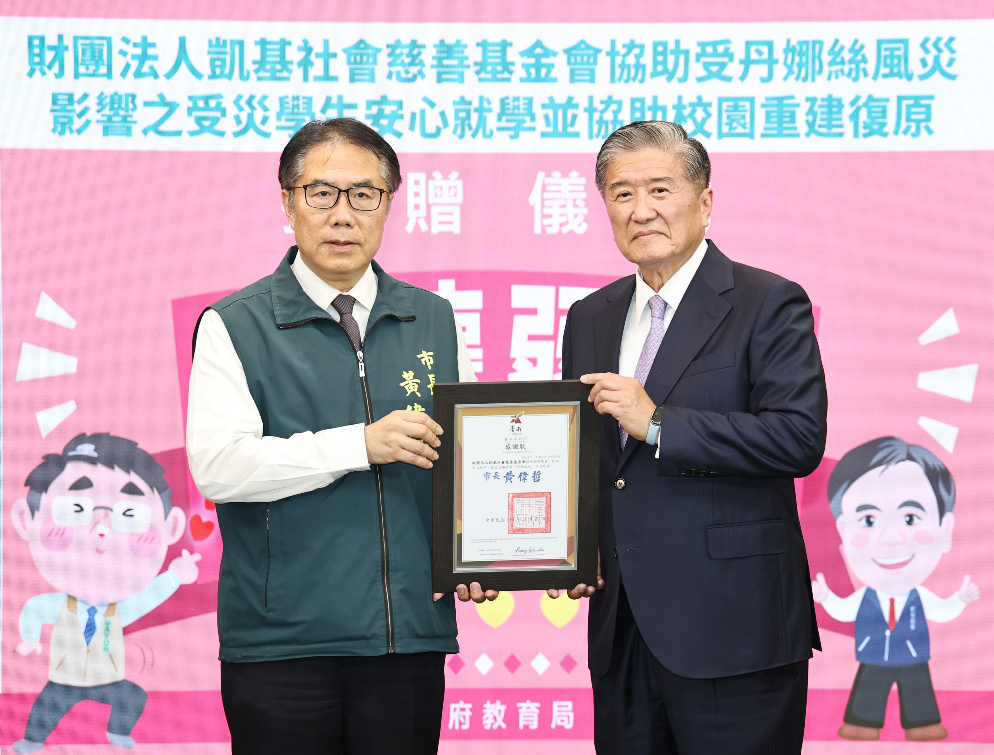 圖說:凱基慈善基金會協助丹娜絲風災校園重建獲表揚,由臺南市長黃偉哲(左)頒發感謝狀,凱基慈善基金會執行長曾錦隆代表領獎。