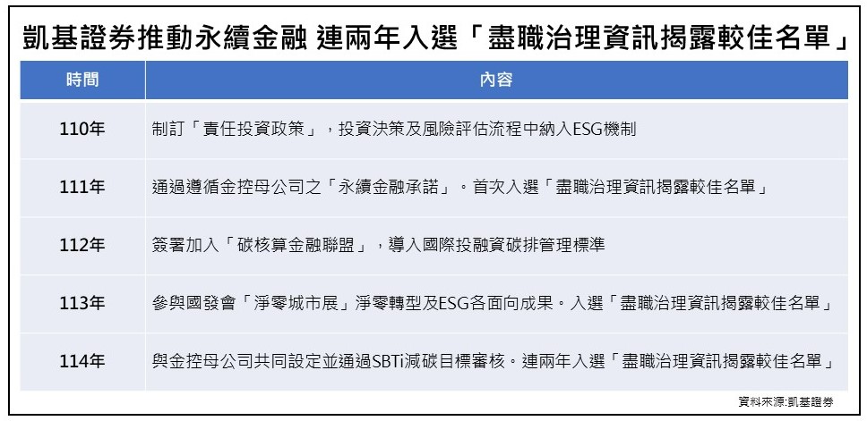 凱基證券為接軌國際責任投資原則,積極推動永續金融,自簽署「機構投資人盡職治理守則遵循聲明」後,迅速制訂「責任投資政策」,將ESG納入投資決策與風險評估流程,並透過關注被投資公司營運狀況、出席股東會行使投票權及議合互動,落實盡職治理;在淨零行動方面,凱基證券同時因應全球去碳化趨勢,遵循金控「永續金融承諾」,簽署加入「碳核算金融聯盟」,導入國際投融資碳排管理標準,建構氣候變遷風險管理機制,亦遵循SBTi(科學基礎減碳目標)國際標準,以具體行動實踐全資產淨零碳排目標,並於114年5月通過SBTi審核,足見積極落實碳管理措施,藉此推動企業永續轉型,加速實現淨零排碳願景。