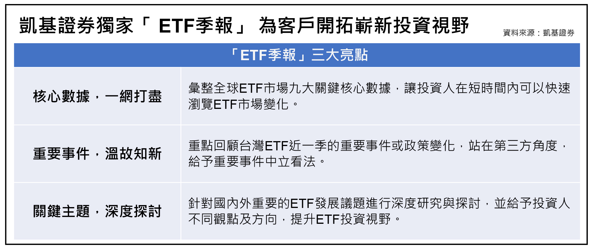 凱基證券財富管理處主管阮建銘表示,ETF雖已成為國人最青睞的投資工具之一,投資人卻仍常面臨許多投資盲區,例如市場追捧熱門ETF而導致溢價風險、追求配息卻忽略總報酬率,或是忽略指數編製、商品設計是否適合自己。為此,凱基證券專業團隊以「ETF季報」為平台,期許在資訊爆炸的環境下,以ETF專業券商的角色,提供投資人一個正式、可信賴的資訊管道,幫助客戶更有自信投資ETF。