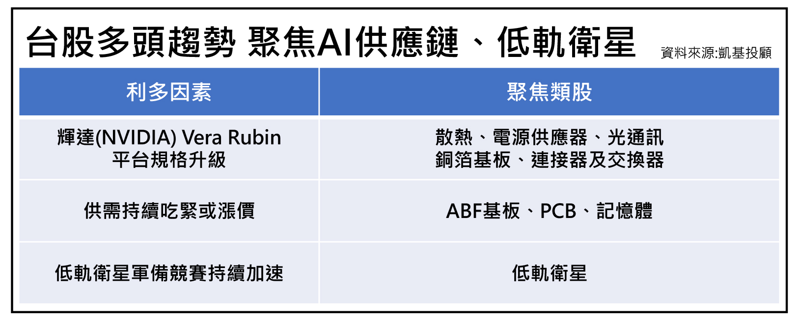 展望後市,未來若因地緣政治引發市場修正,均可視為中長線布局良機,而在AI與低軌衛星軍備競賽持續加速的背景下,相關供應鏈仍是布局的核心主軸。首選受惠輝達(NVIDIA) Vera Rubin平台規格升級的散熱、電源供應器、光通訊、銅箔基板、連接器及交換器族群;其次為供需持續吃緊的ABF基板、PCB、記憶體產業。