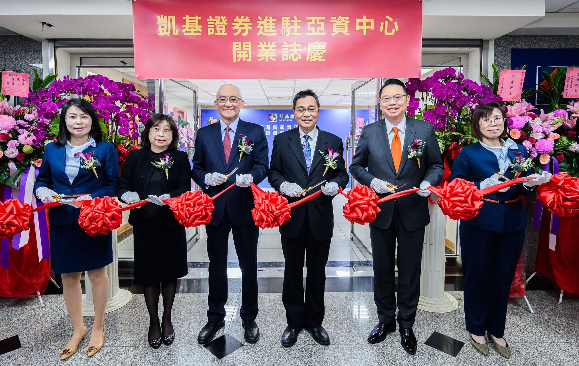 圖說:凱基證券進駐亞資中心高雄專區,由凱基證券副董事長糜以雍(左三)、高雄市經發局副局長林廖嘉宏(右三)代表出席開業剪綵。