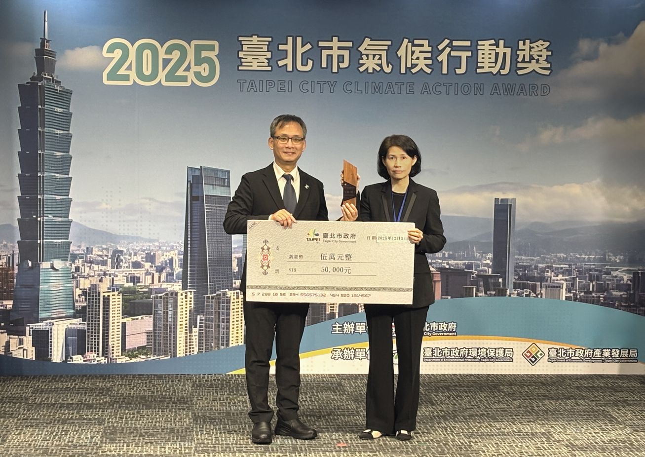 圖說:凱基證券榮獲臺北市氣候行動獎,由臺北市副市長張溫德(左)頒獎,凱基證券行政管理部主管黃玉佩代表領獎。