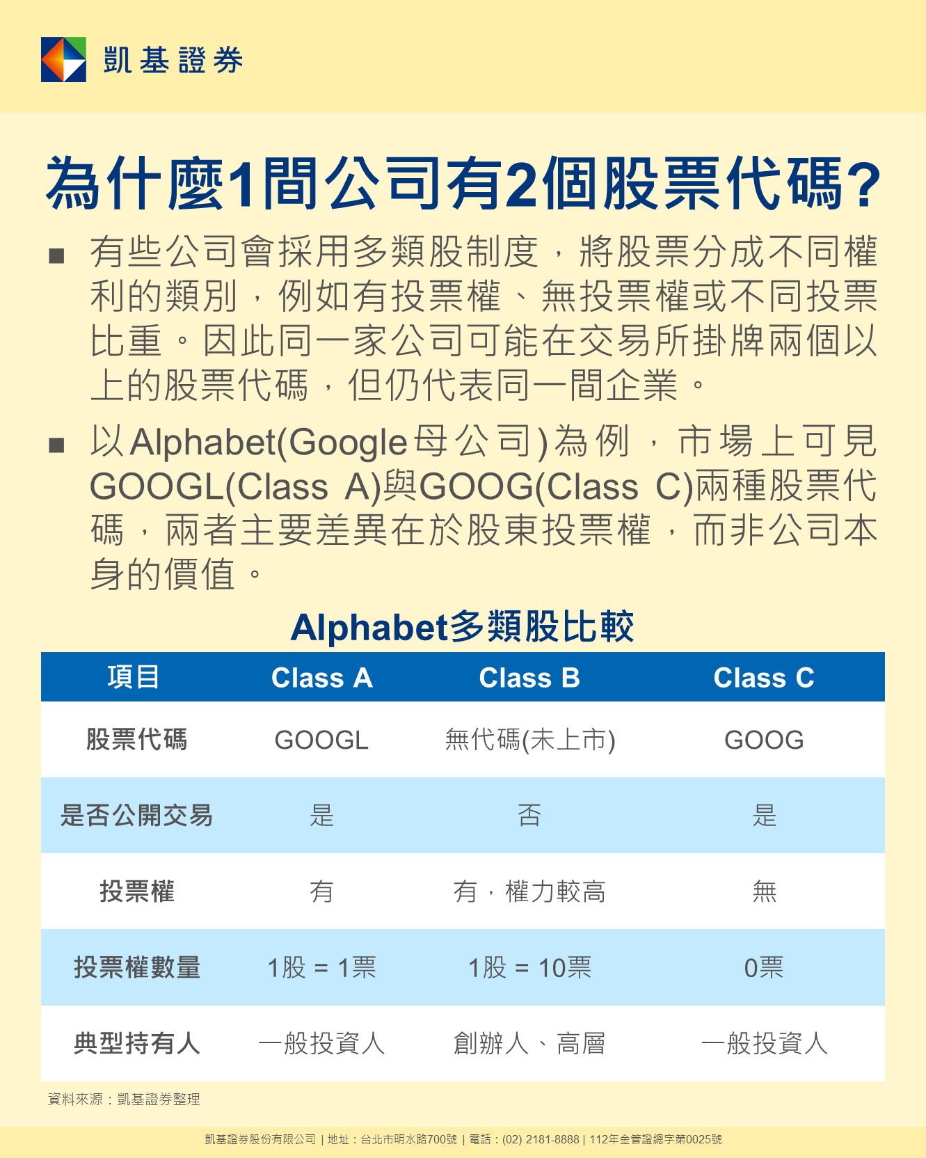 📖有些公司會採用多類股制度,將股票分成不同權利的類別,例如有投票權、無投票權或不同投票比重。因此同一家公司可能在交易所掛牌兩個以上的股票代碼,但仍代表同一間企業。以Alphabet(Google母公司)為例,市場上可見GOOGL(Class A)與GOOG(Class C)兩種股票代碼,兩者主要差異在於股東投票權,而非公司本身的價值。