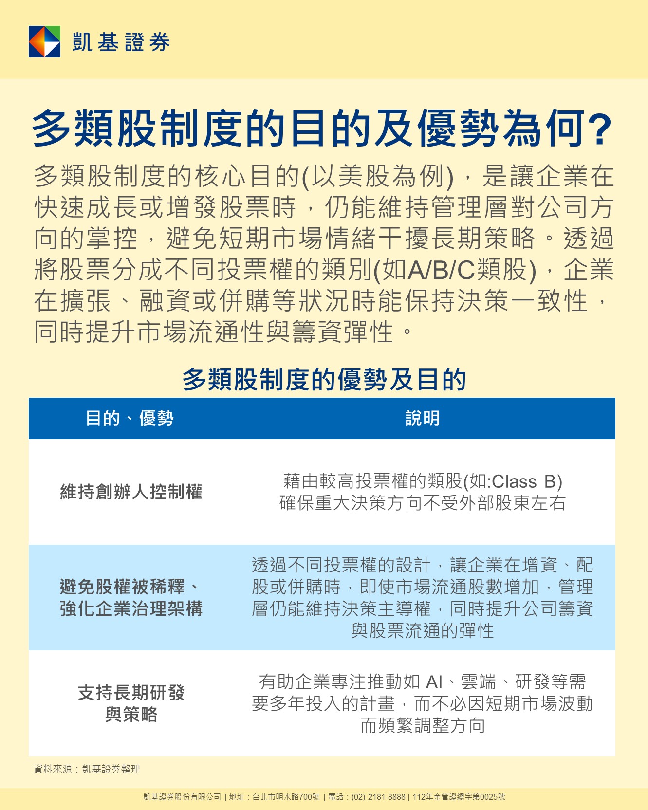 📖多類股制度的核心目的(以美股為例),是讓企業在快速成長或增發股票時,仍能維持管理層對公司方向的掌控,避免短期市場情緒干擾長期策略。透過將股票分成不同投票權的類別(如A/B/C類股),企業在擴張、融資或併購等狀況時能保持決策一致性,同時提升市場流通性與籌資彈性。