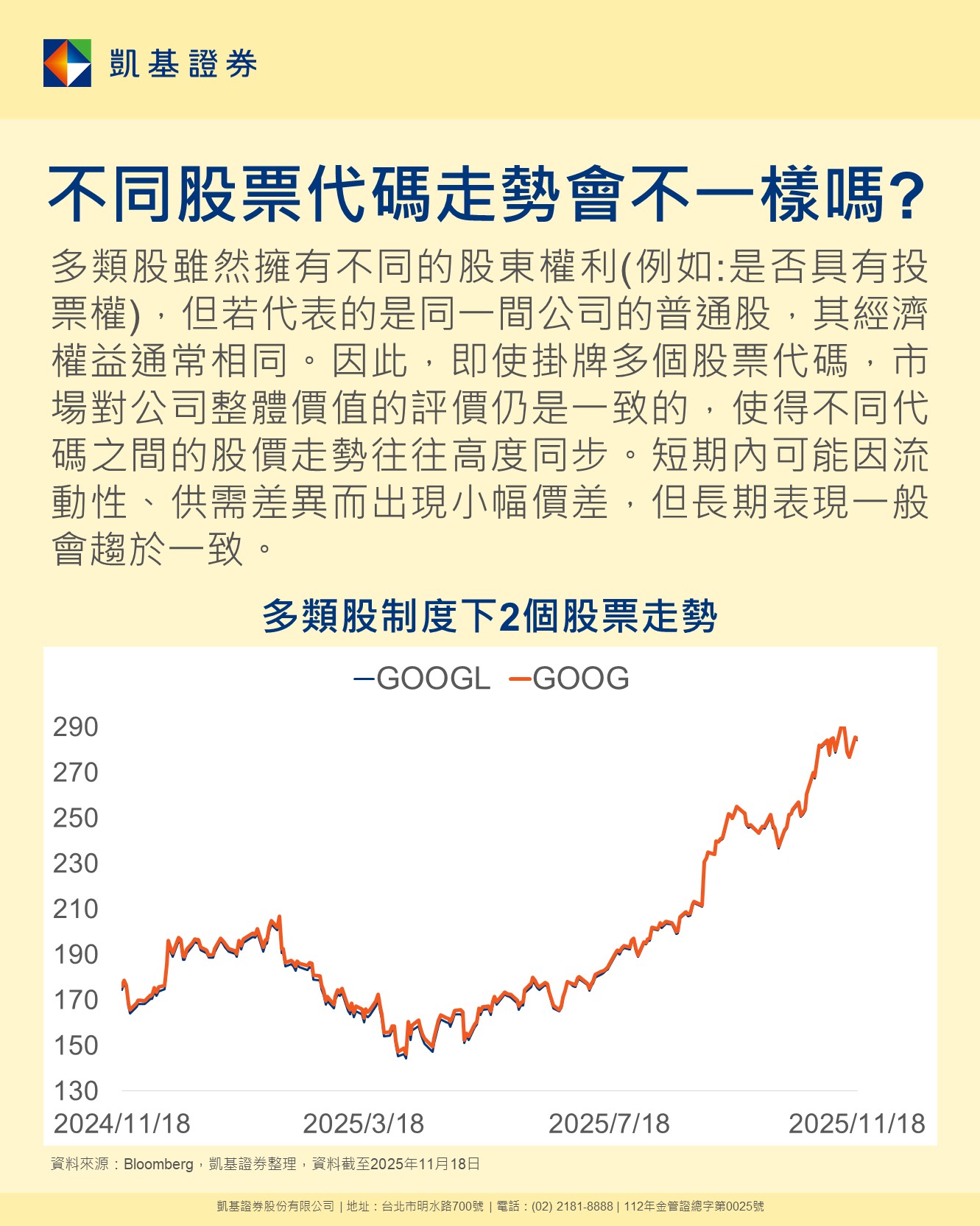 📖多類股雖然擁有不同的股東權利(例如是否具有投票權),但若代表的是同一間公司的普通股,其經濟權益通常相同。因此,即使掛牌多個股票代碼,市場對公司整體價值的評價仍是一致的,使得不同代碼之間的股價走勢往往高度同步。短期內可能因流動性、供需差異而出現小幅價差,但長期表現一般會趨於一致。