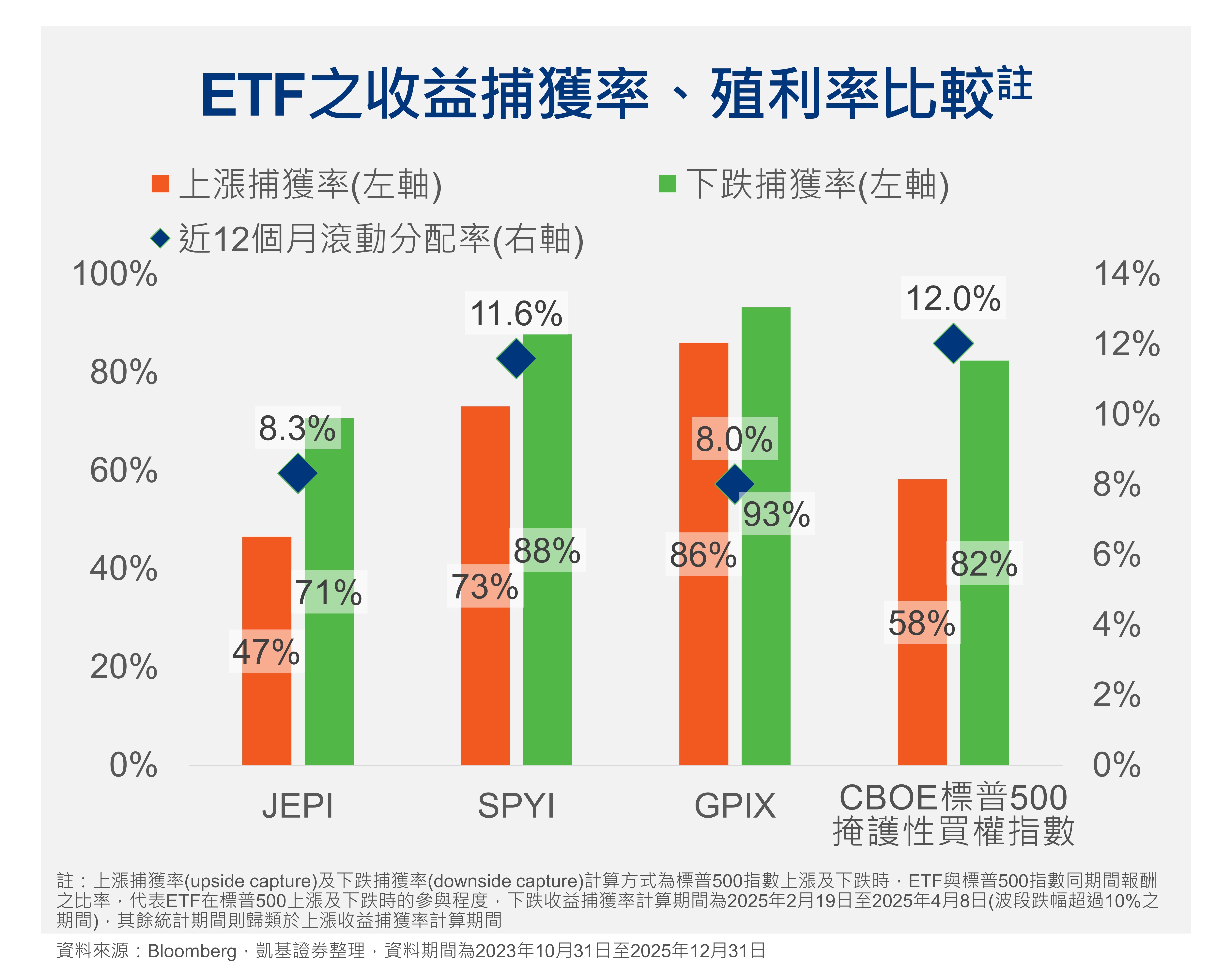 不同的策略操作,除了影響收益分配外,在大盤上行及下行時,捕獲率也有所差異。J.P.Morgan股票溢價收益主動型ETF (JEPI.US)在標普500震盪時創造出比掩護性買權指數更好的抗震效果,但在上漲時也表現相對落後;而NEOS標普500高收益主動型ETF、Goldman Sachs標普500溢價收益主動型ETF (GPIX.US)則是改善了傳統掩護性買權指數於牛市的績效落後風險,但在標普500震盪時,下檔保護效果也較掩護性買權指數來得不佳。