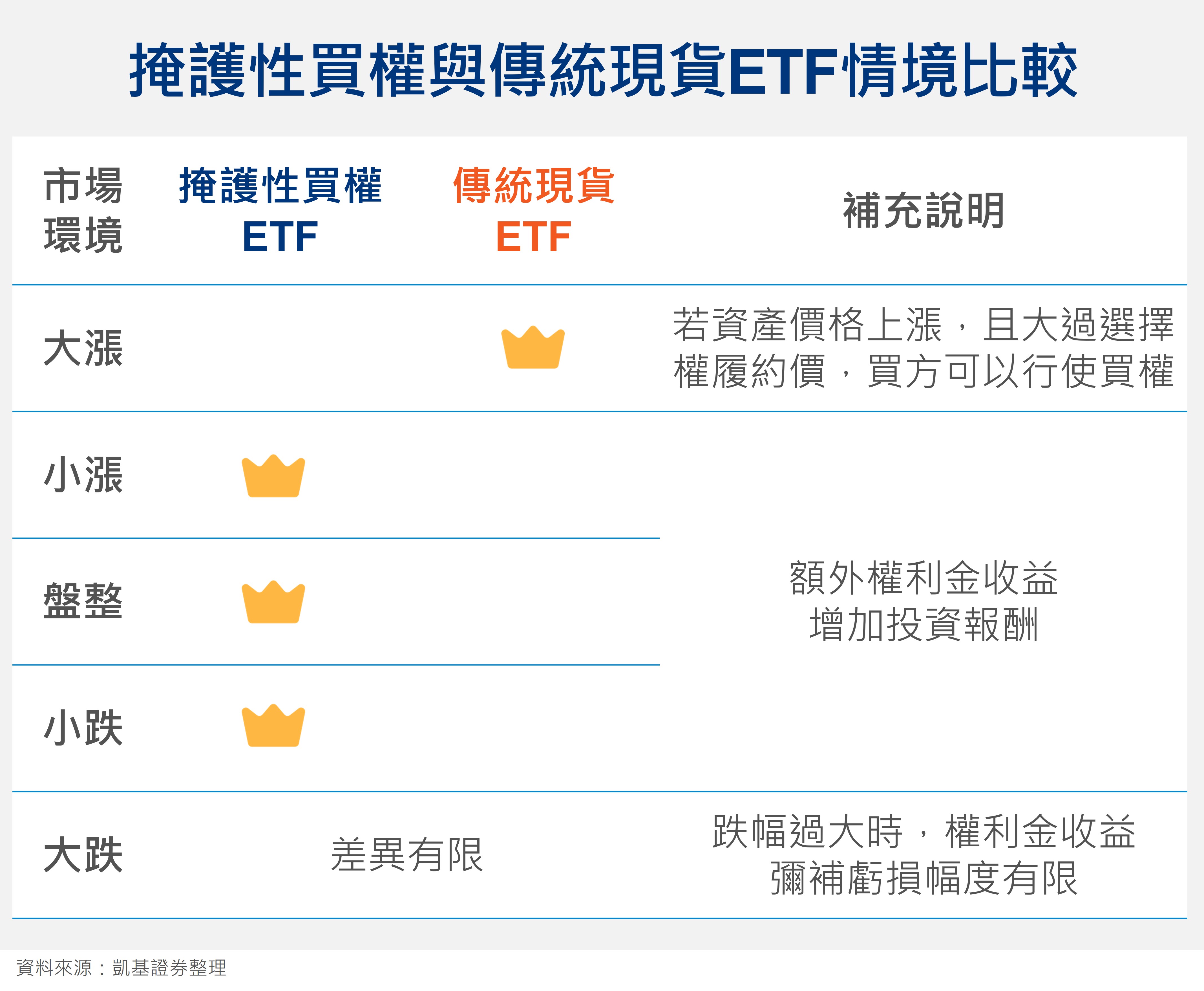 與傳統現貨ETF比較,掩護性買權ETF於盤勢小幅震盪時具優勢,主要原因在於此時選擇權權利金給予ETF增添額外收益,使得這時候整體投資表現會較傳統現貨ETF來的優異。而當掩護性買權ETF的賣出買權到期時,若資產價格上漲,且大過履約價,買方可以行使買權。因此ETF持有資產的部分獲利得拿來賠償給買方,造成ETF獲利空間限縮。另外,當市場處於大跌時,掩護性買權ETF的權利金收益對於整體資產虧損帶來的彌補則相對有限,因此ETF投資人仍可能面臨不小的虧損。