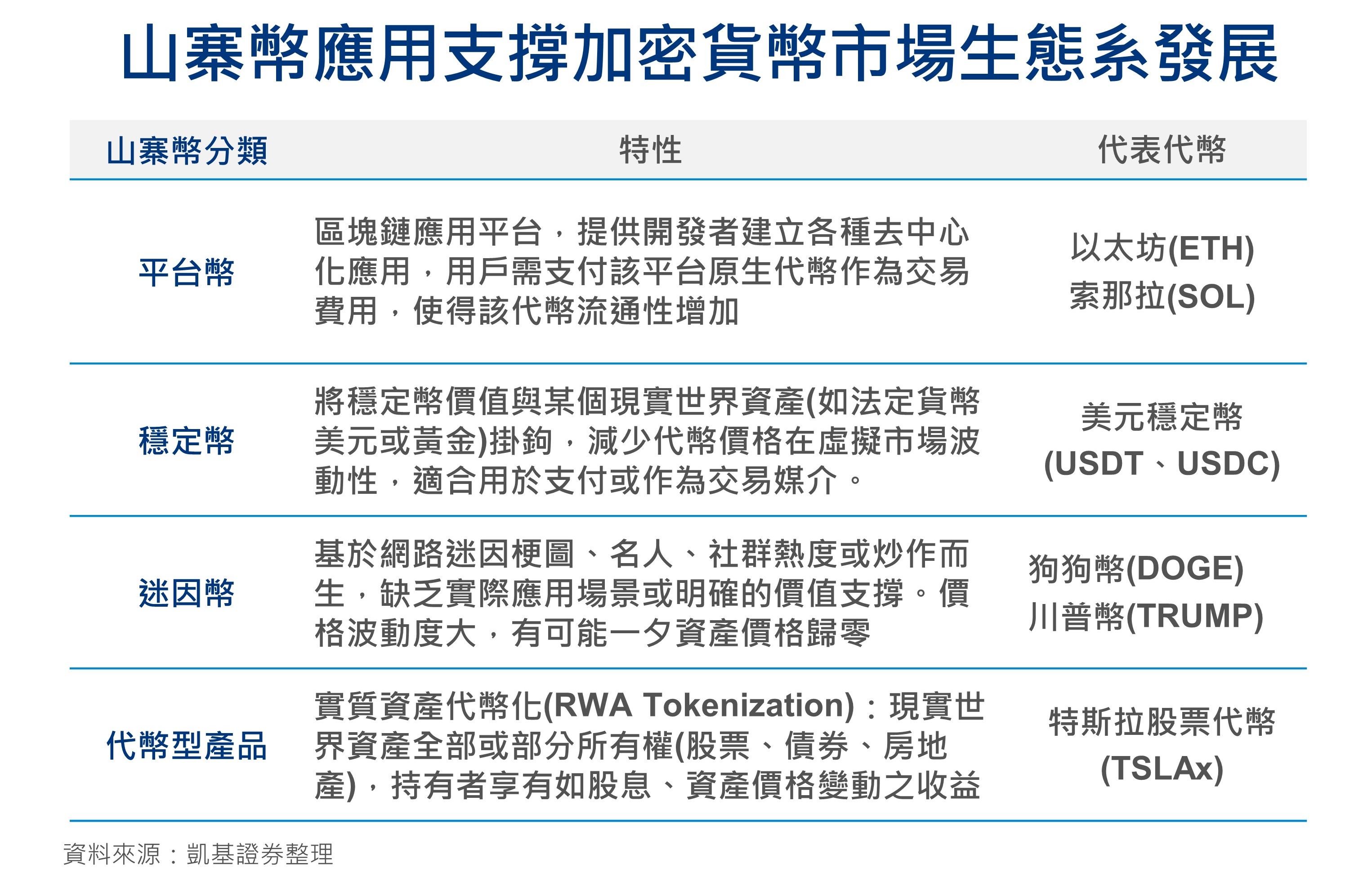 以太坊發展帶來智能合約平台興起,催生出去中心化應用(Dapps)、去中心化金融(DeFi)、非同質化代幣(NFT)等。多樣化應用場景推升更多山寨幣發展,類型大致可分為:平台幣、穩定幣、迷因幣、代幣型產品(如 RWA Tokenization)。平台幣作為應用平台的原生代幣,常用於支付交易費用、提升代幣流通;穩定幣與美元或黃金等現實資產掛鉤、波動較小;迷因幣依社群熱度或話題炒作,通常缺乏基本面、波動極大;代幣型產品則將股票、債券、房地產等資產代幣化,持有人可能享有股息或價格變動收益。