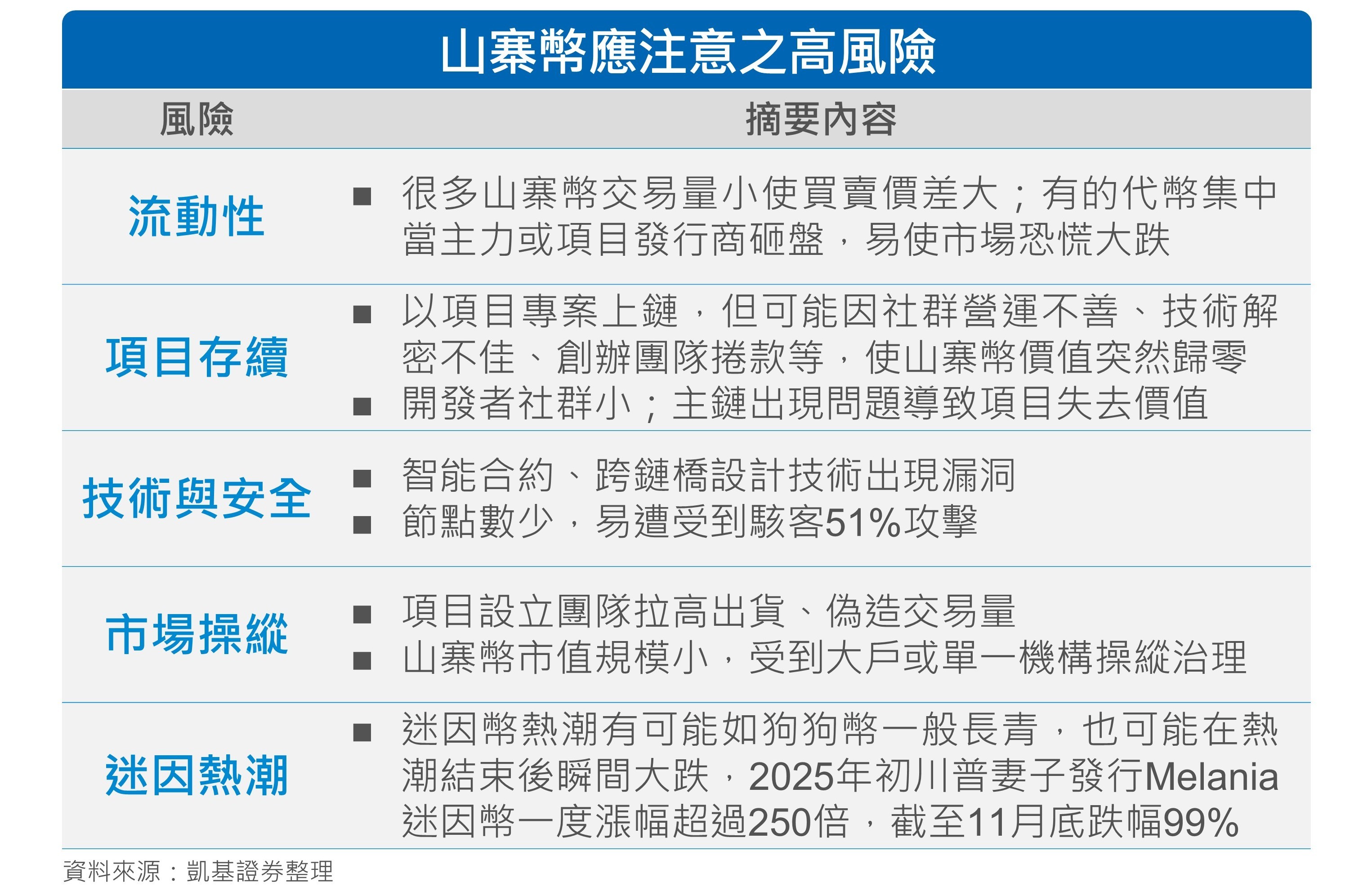 加密貨幣應用興起也使得山寨幣蓬勃發展。在市場大好(牛市)時,山寨幣漲幅驚人;然而由於市值規模仍小,遇市場反轉、人為操控或駭客攻擊時,價格波動大甚至可能歸零,投資人需注意山寨幣高風險特性!