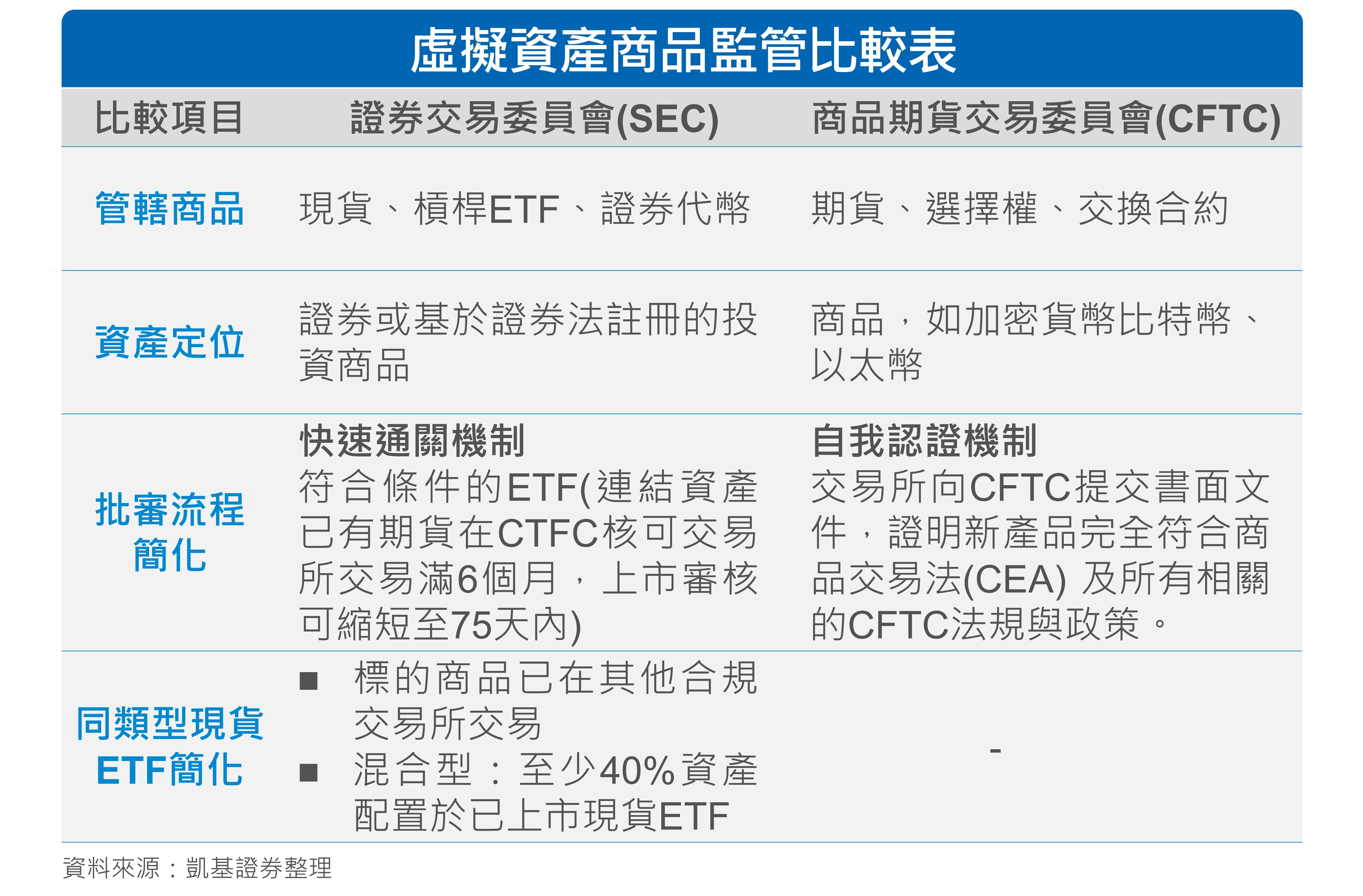 美國證券交易委員會(SEC)將虛擬資產現貨ETF納入通用上市標準,簡化批審流程,建立快速通關機制,符合條件的ETF(連結資產已有期貨在商品期貨交易委員會核可交易所交易滿6個月,上市審核可縮短至75天內),監管趨勢朝向簡化與協作,由SEC與商品期貨交易委員會(CFTC)共同負責。另外,2026年初SEC與CFTC共同宣布啟動Project Crypto計畫,建立統一數位資產分類法,消除管轄權爭議,目標加速加密貨幣融入傳統金融市場體系。
