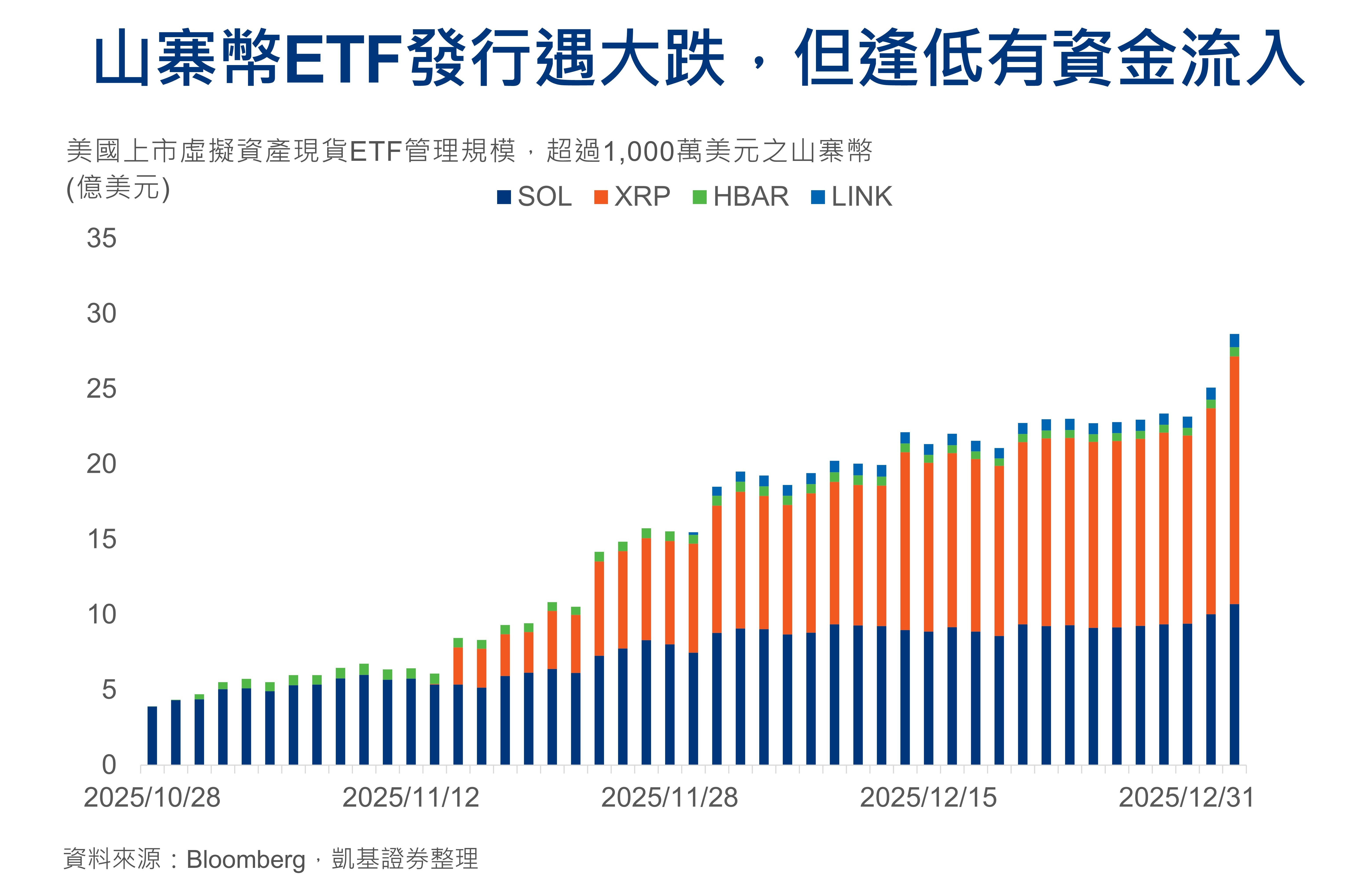 2025年10月起虛擬資產現貨ETF上市流程加速,索拉納(SOL)率先過審,然而,瑞波幣(XRP)上市後規模快速擴張超越SOL,成為最大山寨幣現貨ETF。山寨幣波動更高,儘管2025年第四季山寨幣價格弱勢,但現貨ETF資產為傳統機構投資人資產配置良好管道,資金流抵銷價格下跌壓力,規模穩步增加。儘管有資金流配置於新上市山寨幣現貨ETF,然而,其整體規模仍遠小於比特幣和以太坊現貨ETF,山寨幣整體市值規模偏小,易受到市場情緒超漲超跌的情形仍存,建議有興趣投資人仍以小部位配置為主。