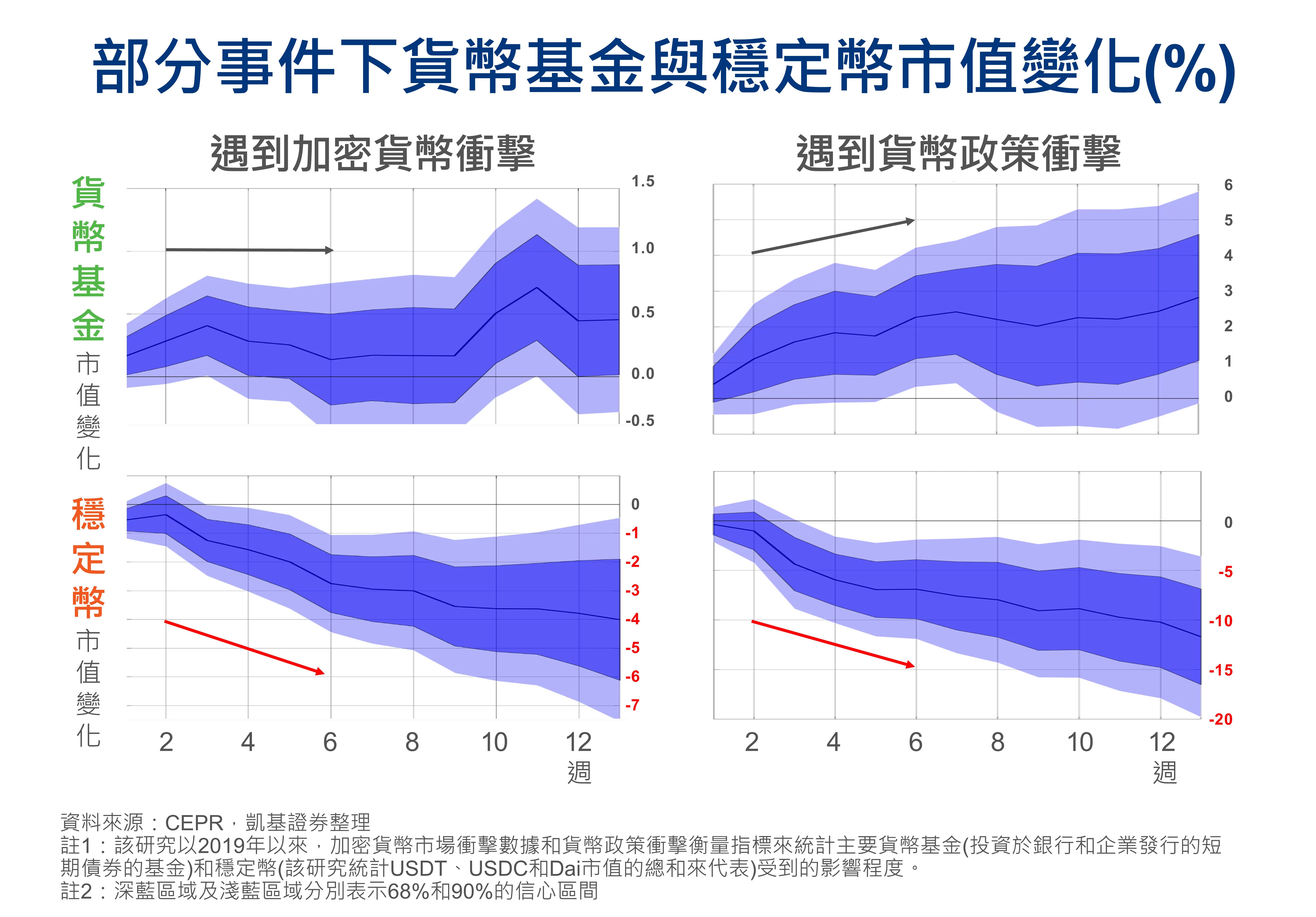 穩定幣的資產負債表結構與貨幣基金非常相似,兩者在一般市場承壓期間常見到避險買盤流入,行為上有高度相似性。然而穩定幣對市場情緒更敏感,部分事件可能帶來市值擴張,也有事件會造成規模縮減或短期脫鉤壓力。相較之下,貨幣基金受到的影響小很多。部分學者的研究也發現,2019年以來的加密貨幣衝擊,對穩定幣的規模影響不低,而貨幣基金的管理資產規模則沒有明顯變化。而在貨幣政策衝擊時(尤其緊縮政策),穩定幣的規模縮減幅度較為明顯,貨幣基金規模甚至走高,反應了短期市場利率更具吸引力而使資金流入貨幣基金(尤其前面所述,Genius法案禁止支付型穩定幣的發行商支付利息給支付型穩定幣持有者)。整體而言,穩定幣的風險不低,貨幣基金的風險則相對較小。