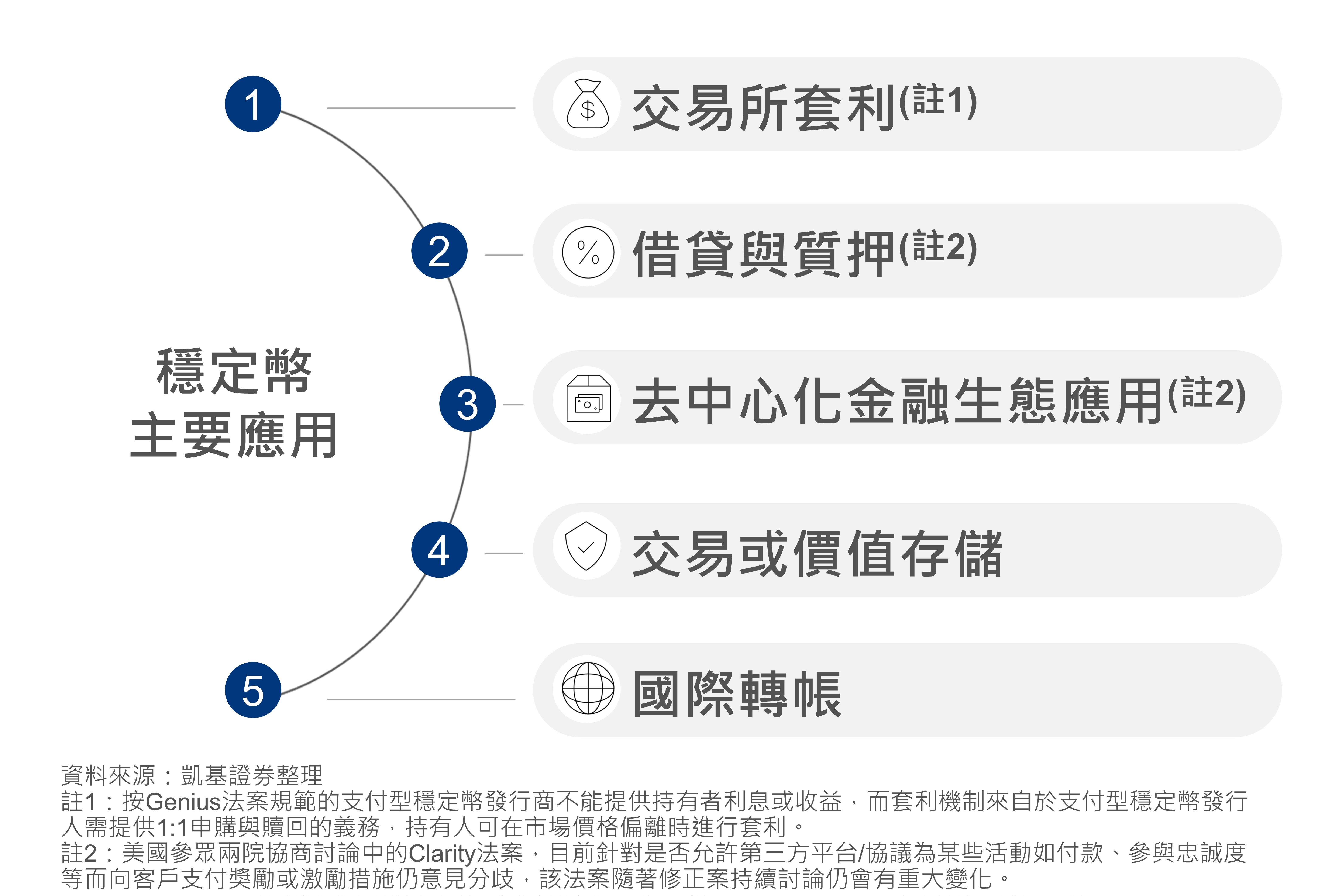 穩定幣結合了區塊鏈技術的優勢,擁有交易速度快、費用低及透明等特性,且支付型穩定幣背後以國庫券及短期流動性資產做為抵押品,因此亦具有一定的價格穩定性,適合用於價值存儲與支付結算。而目前最新Clarity法案針對第三方平台/協議是否可提供獎勵與優惠來提供消費者效益或收益仍意見分歧,隨著該法案的修正案持續討論仍會有重大變化。