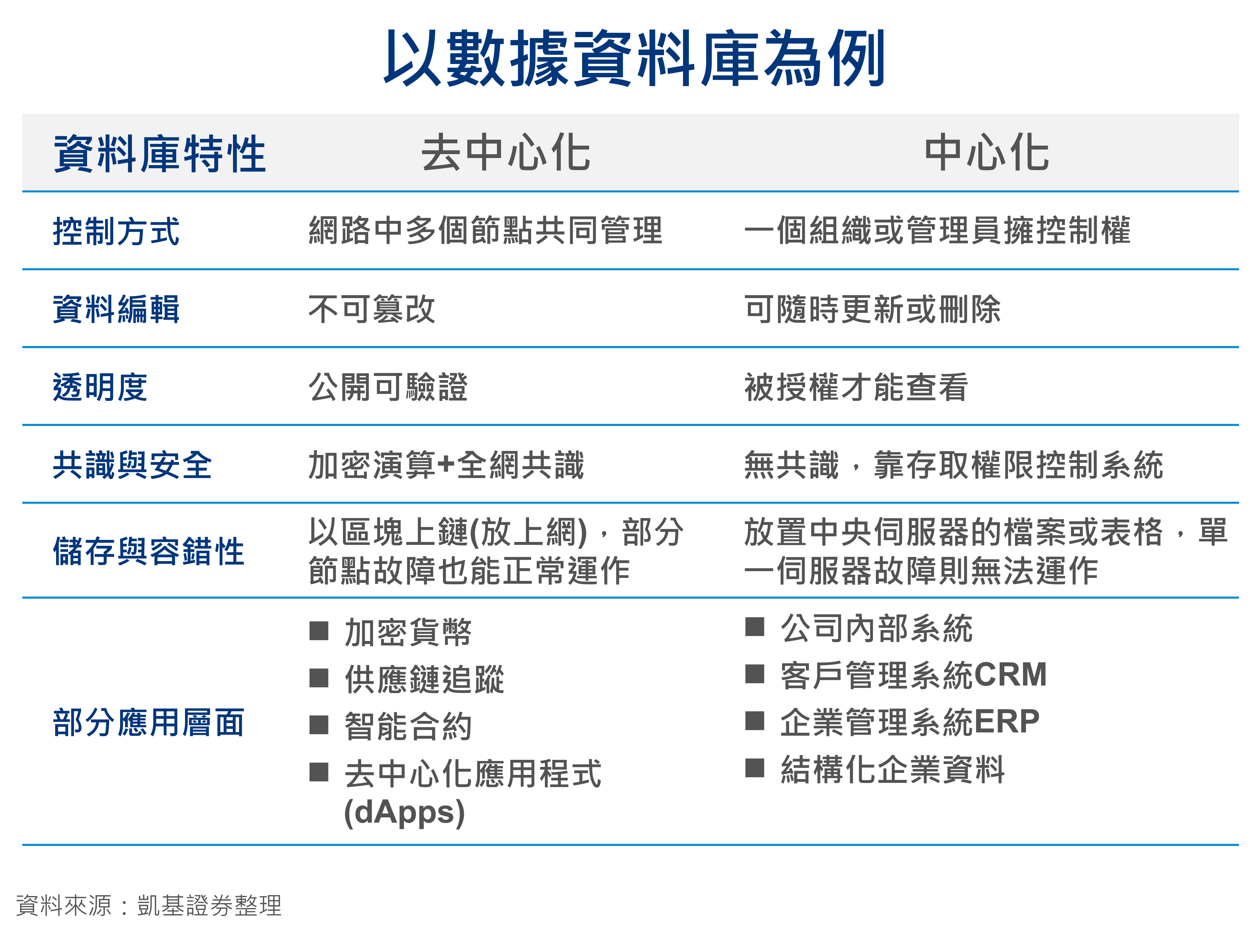目前中心化的資料庫較常應用在企業、銀行或中央機構,主因涉及內部資源及機密。而去中心化技術則因擁有全球網絡及技術公信力優勢,因而有更多應用的機會,包括加密貨幣、供應鏈追蹤、智能合約及越來越廣泛的去中心化應用程式(dApps)。此外,也有視需求採納部分優點而形成的半中心化,如私有區塊鏈或企業聯盟鏈等。虛擬資產在未來將不限於交易與合約應用,去中心化應用程式的多元發展,將持續擴展其應用場景。