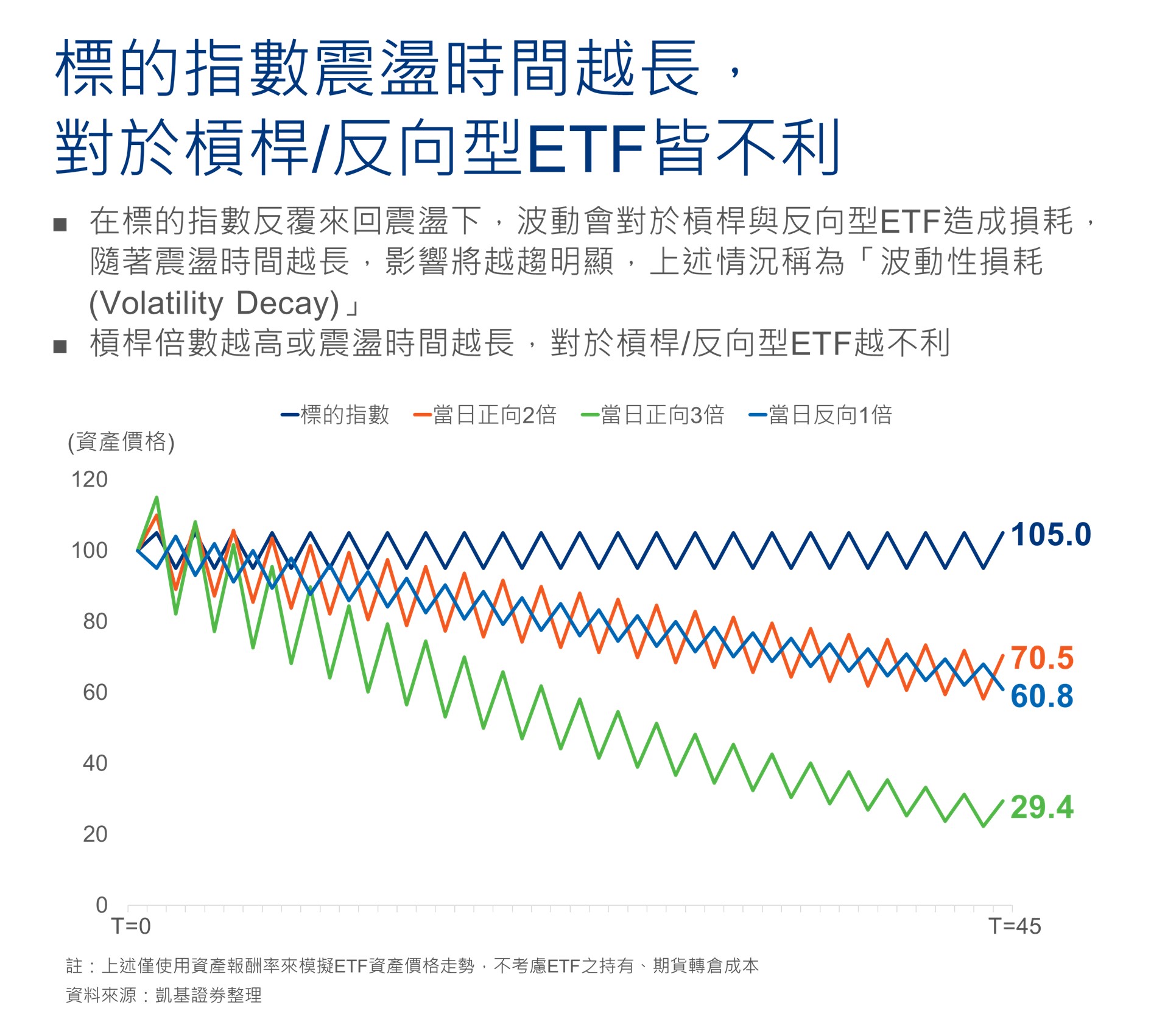 🔍槓桿型ETF的運作方式,為放大標的指數的每日報酬率。標的指數一路上漲時,槓桿ETF因複利效果,持續放大報酬,期間資產因複利效果,期間報酬表現較槓桿倍數佳;但若盤勢轉為震盪,波動會對於槓桿與反向型ETF造成損耗,隨著震盪時間越長,影響將越趨明顯,上述情況稱為「波動性損耗 (Volatility Decay)」,並且,槓桿倍數越高或震盪時間越長,對於槓桿/反向型ETF越不利。