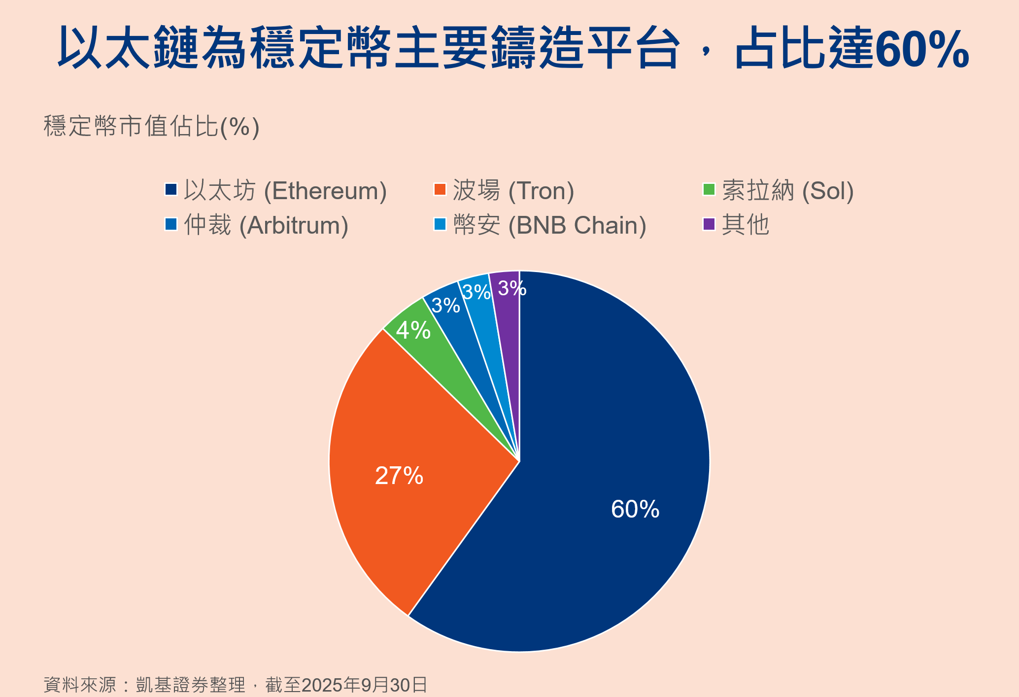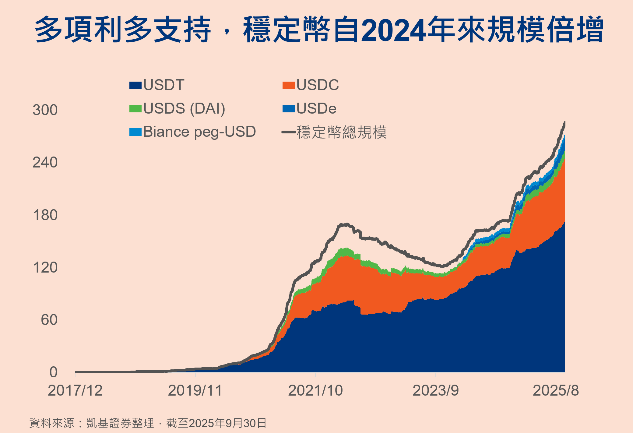 隨加密貨幣應用擴大與市值上升,驅動穩定幣規模成長,加上2025年7月美國GENIUS法案通過後,要求支付型穩定幣需有100%準備做為擔保,市場對穩定幣信心續升,總規模加速擴張於9月底突破2,900億美元。