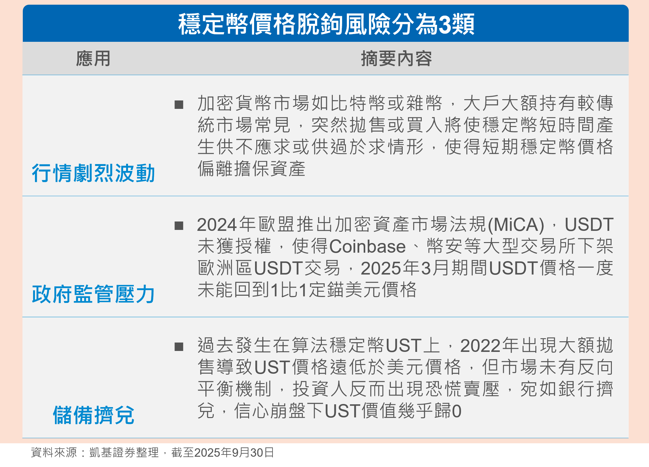然而,穩定幣並不是完全無風險資產,穩定幣於行情發生劇烈波動、政府監管壓力、儲備擠兌的情況可能發生價格脫鉤風險。當價格脫鉤時,投資人需留意規模較小穩定幣,避免發生信心全面崩壞,造成資產永久性減損。