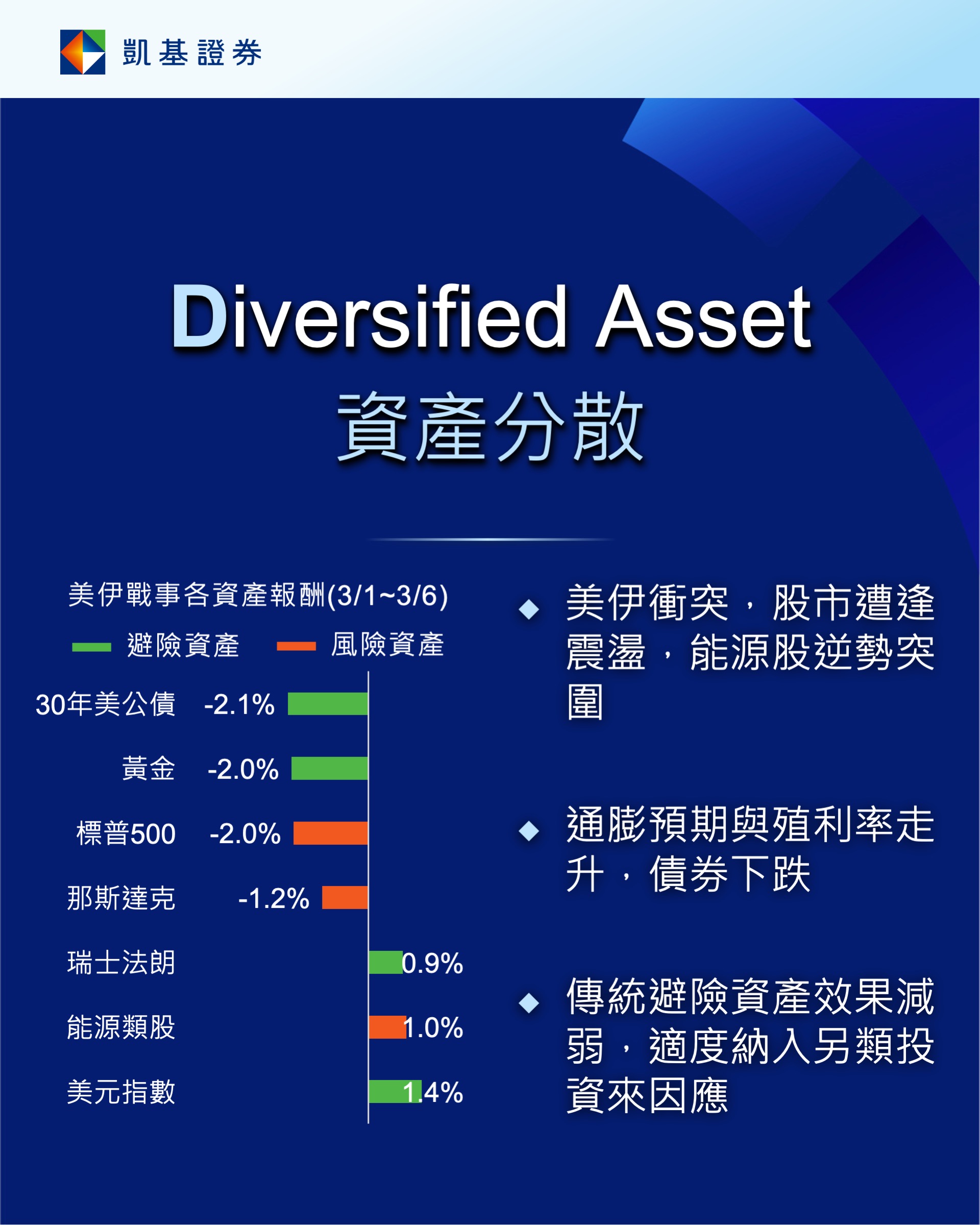 美國經濟仍穩健,但若伊朗戰事惡化使高油價延續,經濟可能放緩,因此短期可布局高品質與防禦股,待衝突緩和淡化且油價亦明顯回落後再逢低布局成長股。此外,國防議題再度浮上檯面,相關主題亦為投資切入點,並可分散布局有政策利多的日股,或具有半導體產業結構性利多題材的新興亞洲。