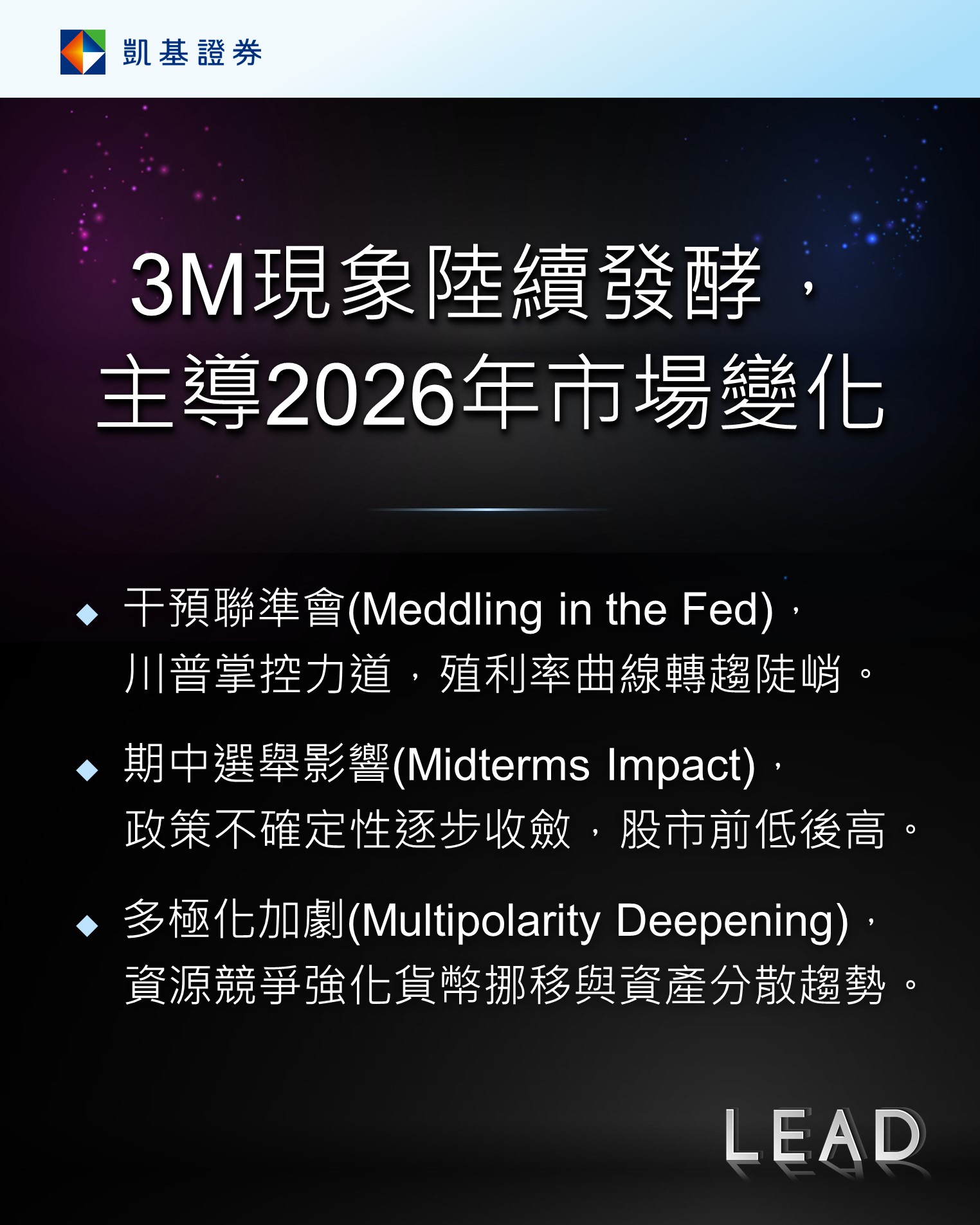 展望2026年,全球經濟動能雖略有放緩,但衰退風險仍低。上半年反映對等關稅的遞延影響,進入下半年,景氣可望逐步回溫。然而,須關注包含干預聯準會(Meddling in the Fed)、期中選舉影響(Midterms Impact)與多極化加劇(Multipolarity Deepening)等貫穿2026年的「3M」現象,這些現象將顯著對2026年的市場走向與投資趨勢帶來深遠影響。
