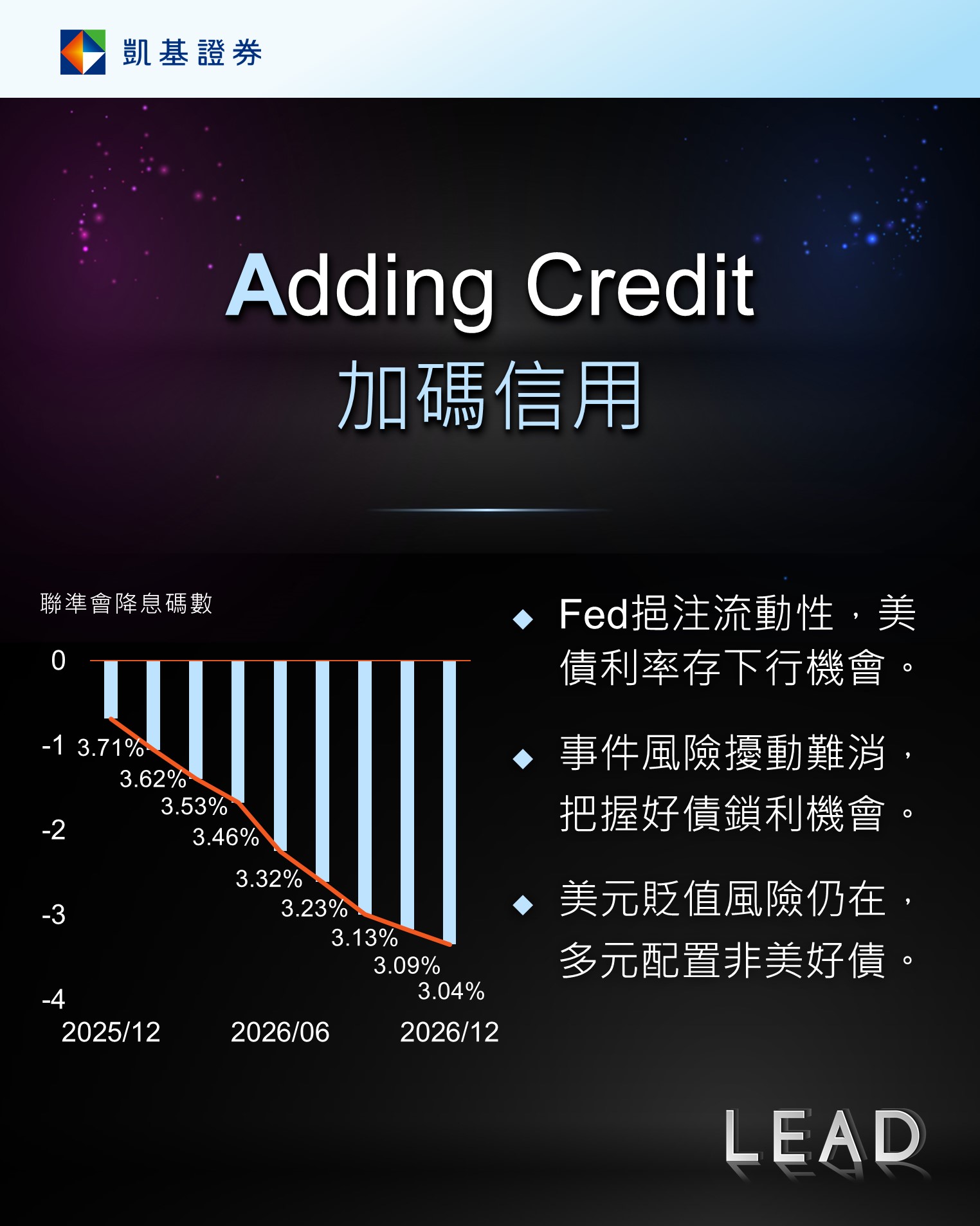 預期2026年上半年景氣趨緩,聯準會停止縮表,未來將MBS到期後轉增持公債,將挹注市場流動性,復以2026年聯準會存在降息空間,美債利率具下行機會,逢利率上行,可布局主要國家公債進行鎖利並降波動。考量2026年美國將舉行期中選舉,恐增添政經擾動,可把握債信穩健信評A級以上企業債鎖利機會,並以風險調整後利差較高者,如金融、公用事業、工業、通訊等產業為主,另預期明年下半年景氣改善,待利差擴大後再伺機加碼非投資級債。復以聯準會與歐、日國家貨幣政策分歧,非美主要國家與美國公債利差存在收窄機會,疊加去美元化風險,宜多元布局歐元等非美主要貨幣投資級債,降低匯率擾動,然政經擾動難消,新興債宜衛星配置。