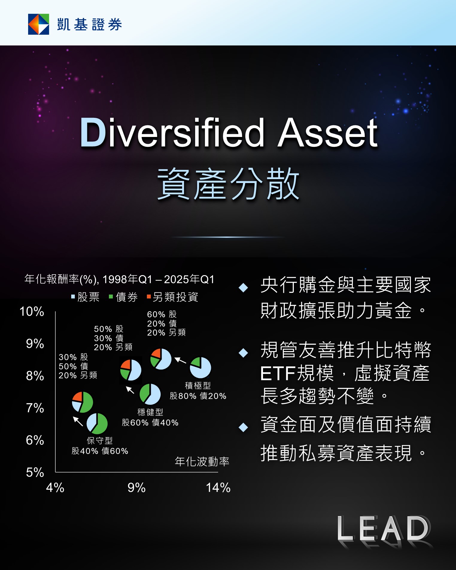美元指數反彈加上聯準會12月降息機率一度下降,近期金價漲多拉回,惟明年聯準會將更偏鴿派,復以全球央行購金托底及政府債務續擴張,提供金價續漲動能。虛擬貨幣短期出現恐慌,惟現貨ETF規模仍近1500億美元,且虛擬貨幣波動度較過往降幅顯著,在投資人接受度提升、規管環境更加友善下,長線利多未有改變。此外,私募資產涵蓋私募股權、私募債權及房產基建等實質資產,其中具成長性的私募股權管理規模最大且持續增長,有望受機構及高淨值投資人青睞。