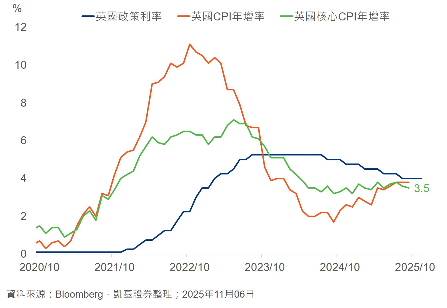 1️⃣英國9月通膨年增率3.8%與上月持平,雖處於近1年來相對高點,但核心通膨年增率為3.5%呈現下滑,通膨壓力稍降,卻仍較其他已開發國家(G7)高,侷限目前可以大幅寬鬆貨幣施政力度。考量即將公布的財政預算案或對經濟造成衝擊,加上現階段經濟與就業疲軟,市場預期本次維持利率不變,但12月將降息。