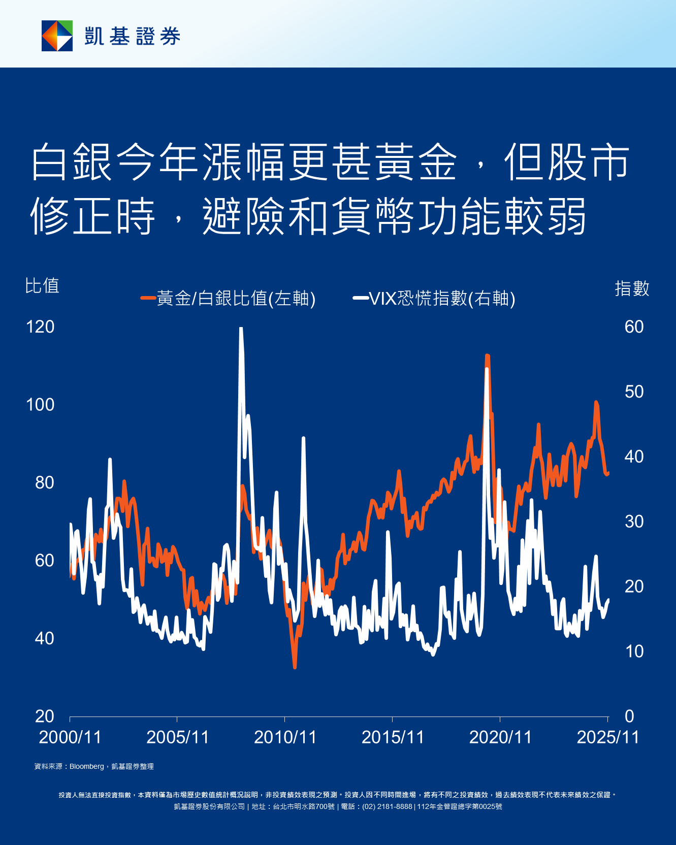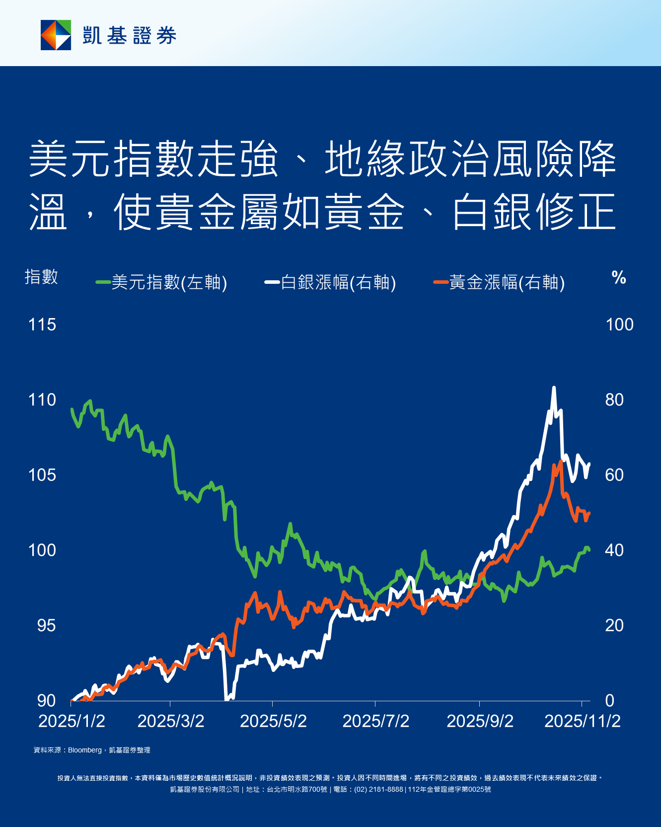 美股回落,資金暫泊美元使其走強,加上美中和談和緩,地緣政治風險降溫,貴金屬價格回調。此外,日本高市早苗當選、傾向貨幣寬鬆,日圓走貶推升美元,貴金屬交易中的槓桿操作退場,加大金銀價格波動度。銀價今年以來大漲68%,走勢更甚黃金,同步回檔修正。