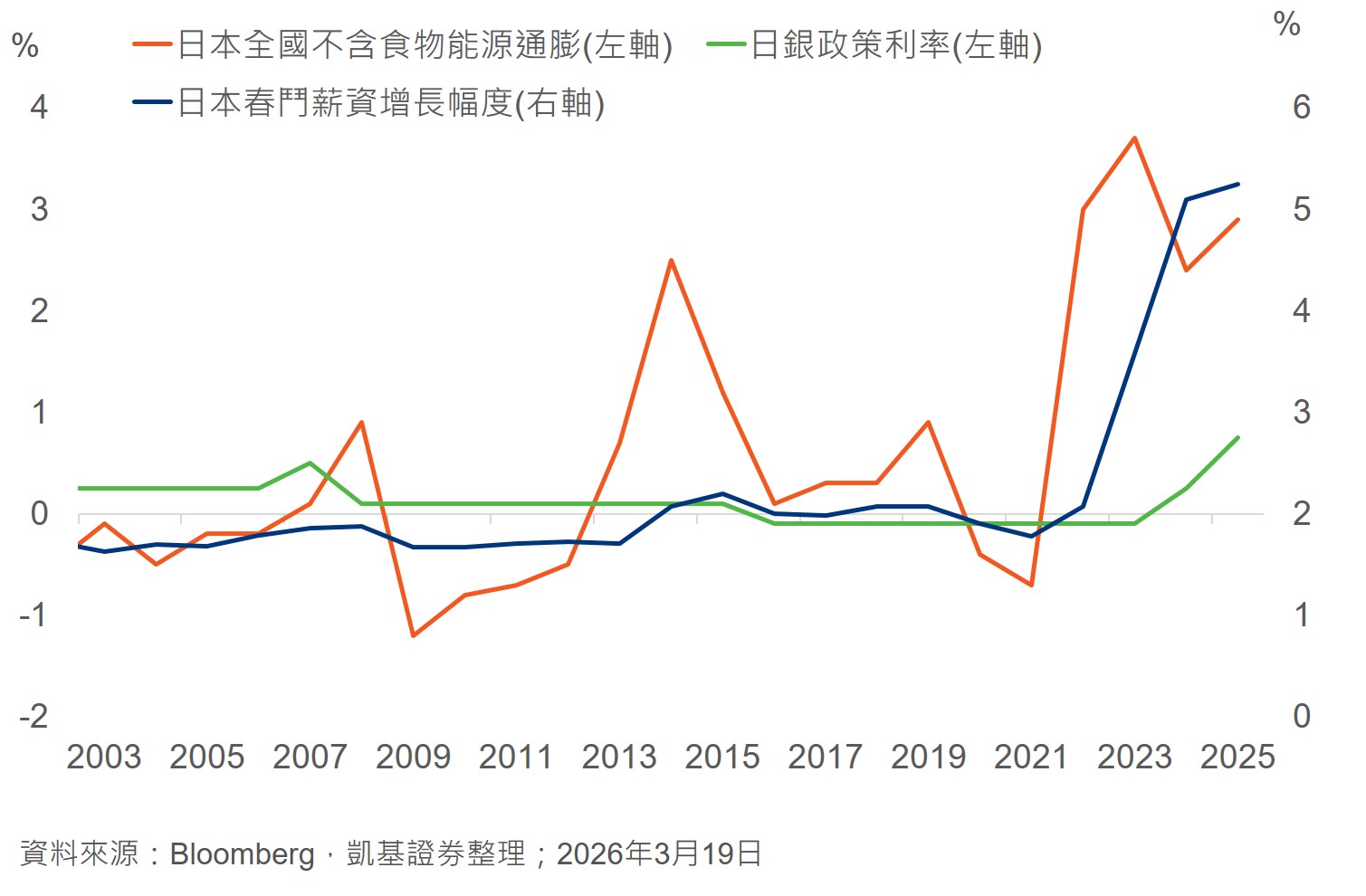 ‣ 觀察2026年春鬥日本工會要求加薪幅度為5.94%,雖低於2025年6.09%,但高於2024年的5.85%,薪資通膨呈現僵固且上升,加上高油價將墊高生產成本,市場預期本次會議日銀雖保持觀望,但今年至少將升息1碼,時點或於下半年。