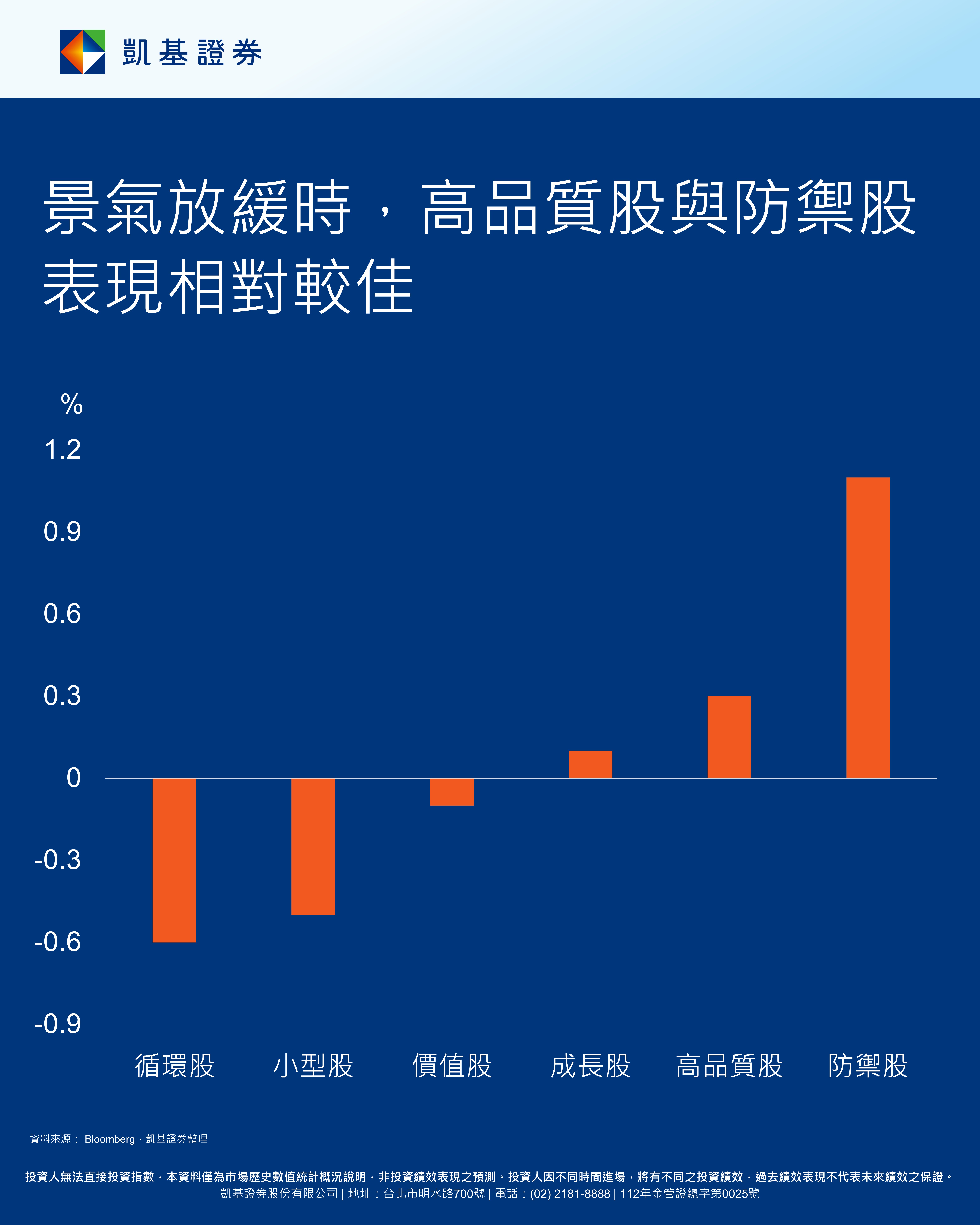 根據統計,高品質股與防禦股多於景氣放緩環境能取得相對較佳的報酬率。除了防禦股具備低波動與抗震特性之外,高品質股因其具有持續之高ROE、負債比低、現金流穩定等特性,在經濟降溫時更能獲得市場資金青睞。此外,考量近期油價攀升,短期可避開易受影響的成長型產業,以降低不確定性所帶來的市場震盪風險。待衝突降溫帶動油價自高點回落,成長股將有望恢復動能。