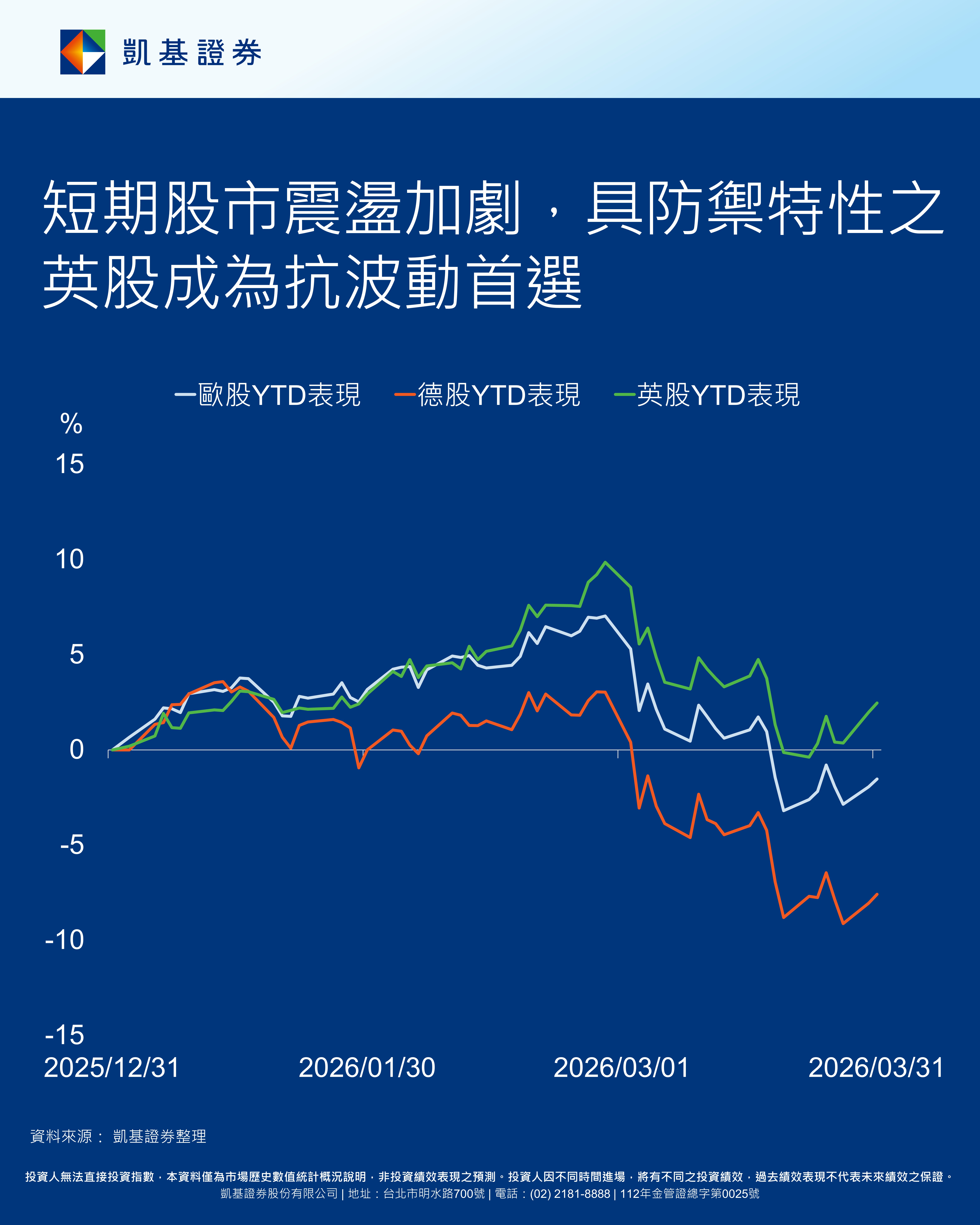 在美伊戰爭走向尚未明朗前,預期歐股走勢將呈現高波動的區間震盪格局。然而,歐洲企業獲利成長動能與德國財政擴張的中長期趨勢並未改變,料成為市場下檔支撐。若衝突持續時間拉長甚至擴大至能源供應層面,油價與通膨壓力可能進一步上升,操作可先行以具防禦特性之英股為主,待衝突降溫並逐步落幕後,再轉換至具循環特性之德股。此外,考量歐洲各國長期將持續提升國防支出,在大盤震盪下歐洲軍工產業仍具備可長線佈局之機會。