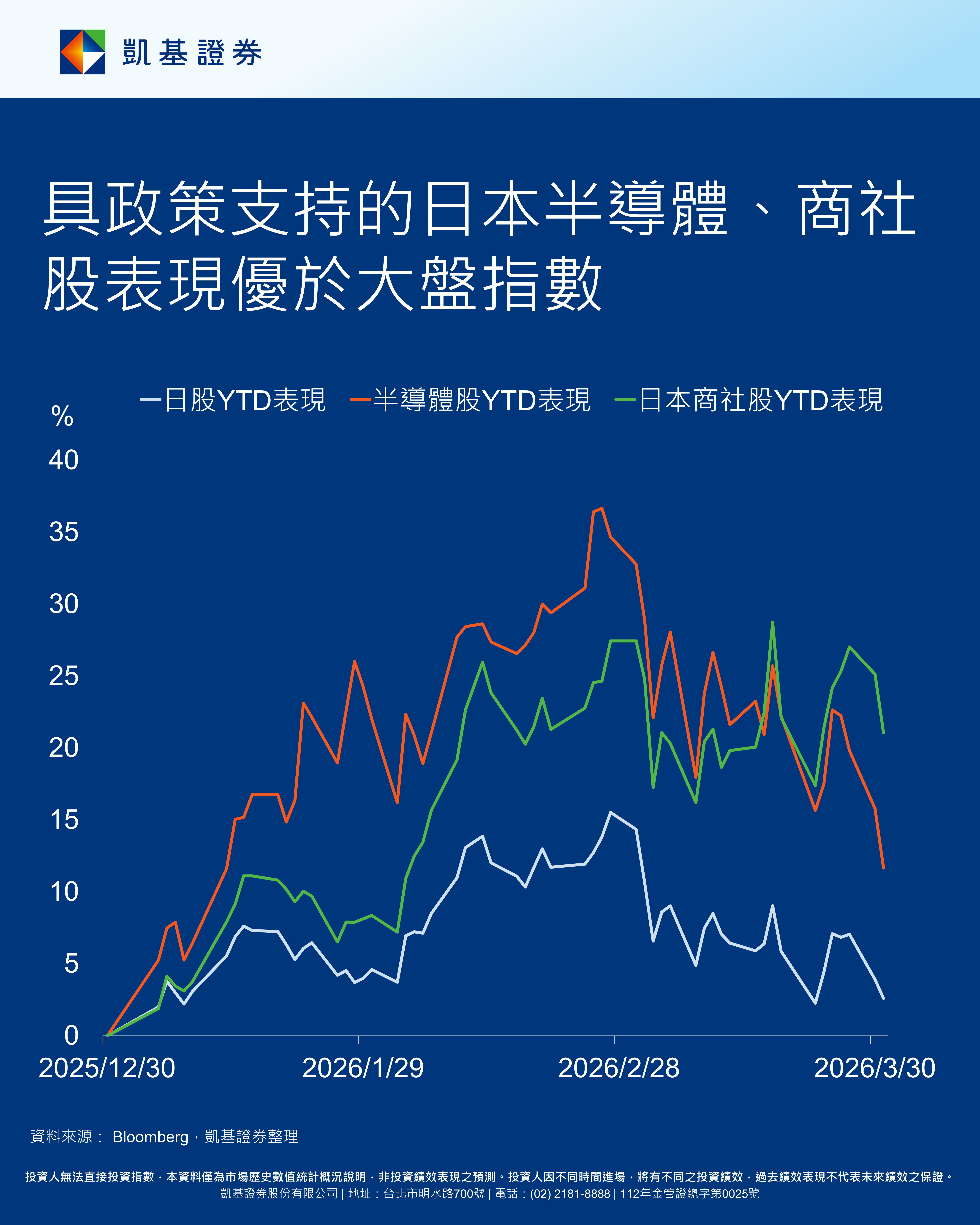 自民黨在高市早苗的領導下取得眾議院大選壓倒性勝利,不僅確立未來數年政策的高度連續性,亦降低未來推動財政刺激措施的阻力。其中為提振日本長期投資不足的問題,將加大在AI、晶片和造船等製造業與工業領域之投資。此外,日本商社具備以單一公司跨足多項領域的多元化經營結構,加上強大的工業製造能力,預期日本商社股與半導體產業將持續受惠此波政策支持效應。