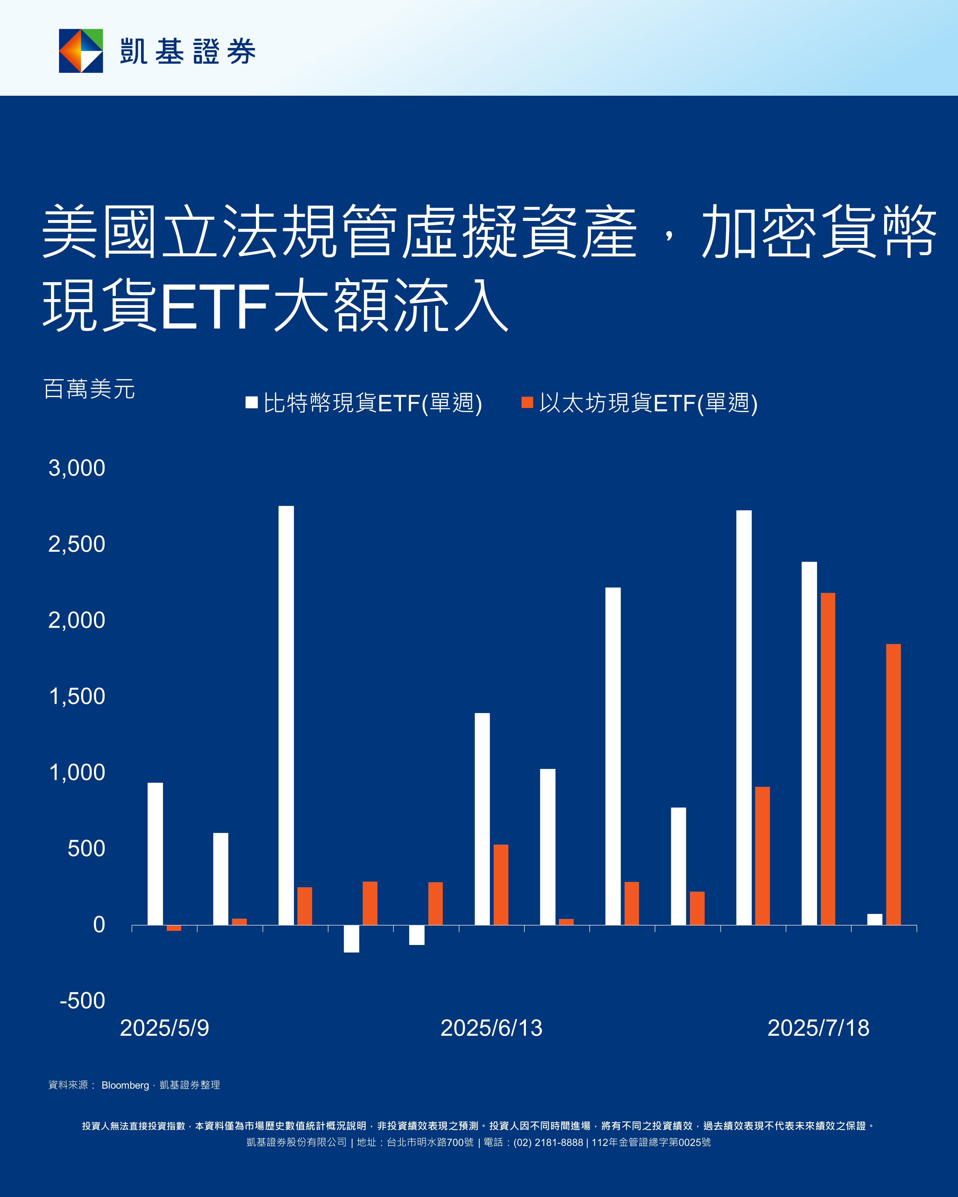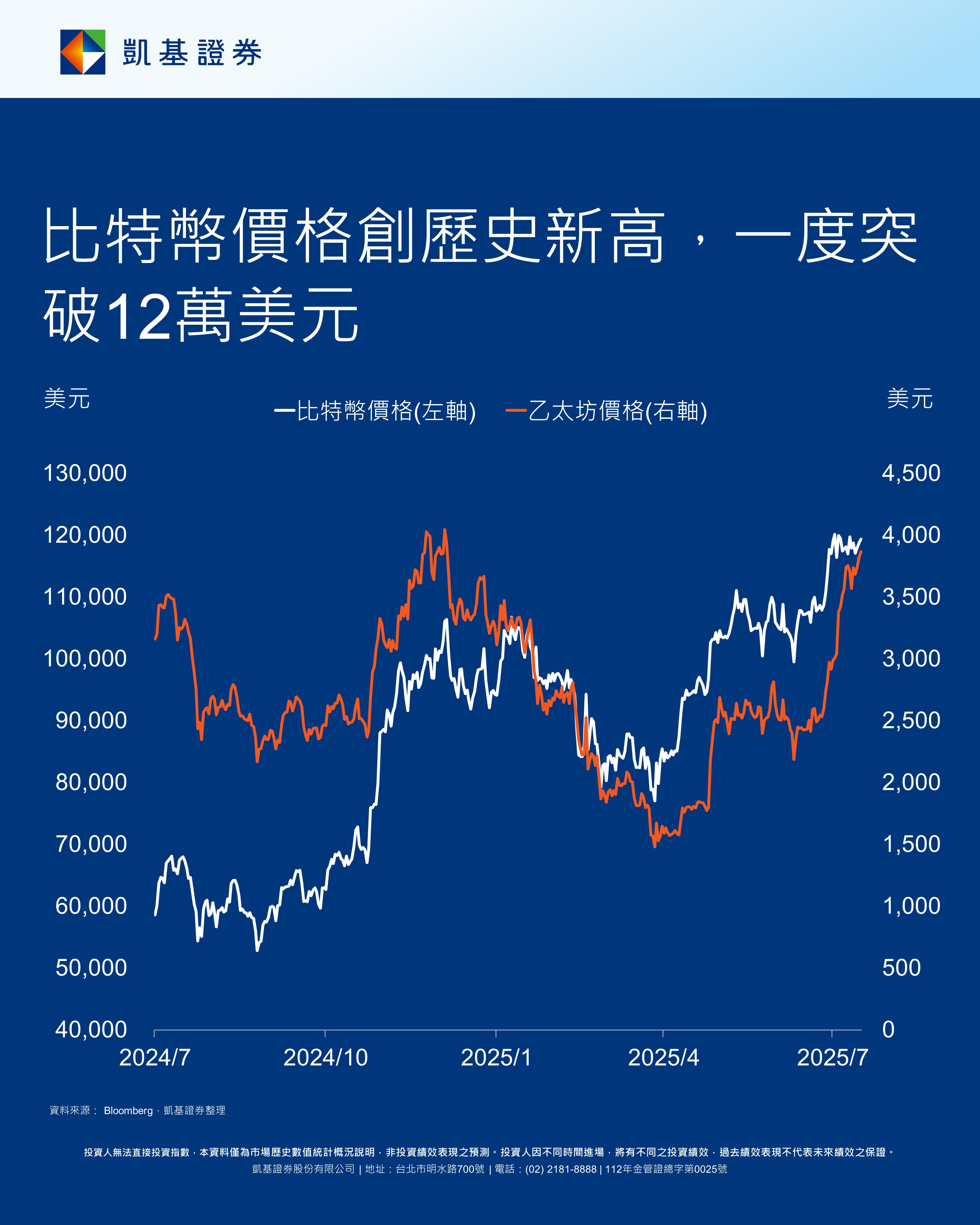 川普為實現其全球加密貨幣中心政見,積極推動金融監管具體化,7月參眾議院通過,川普正式簽署穩定幣法案(GENIUS),確立支付型穩定幣需提供100%準備擔保,且要求為現金或是美國短期公債,將美金本位擴展至虛擬資產。同時,市場結構法案(CLARITY)也在休會前通過眾議院,明定虛擬資產權責主管機關,避免濫權,更有利虛擬資產應用發展,帶動以太坊價格7月份大漲超過60%,比特幣創歷史新高,一度突破12萬美元,顯示市場正面看待川普將虛擬資產納入規管政策。
