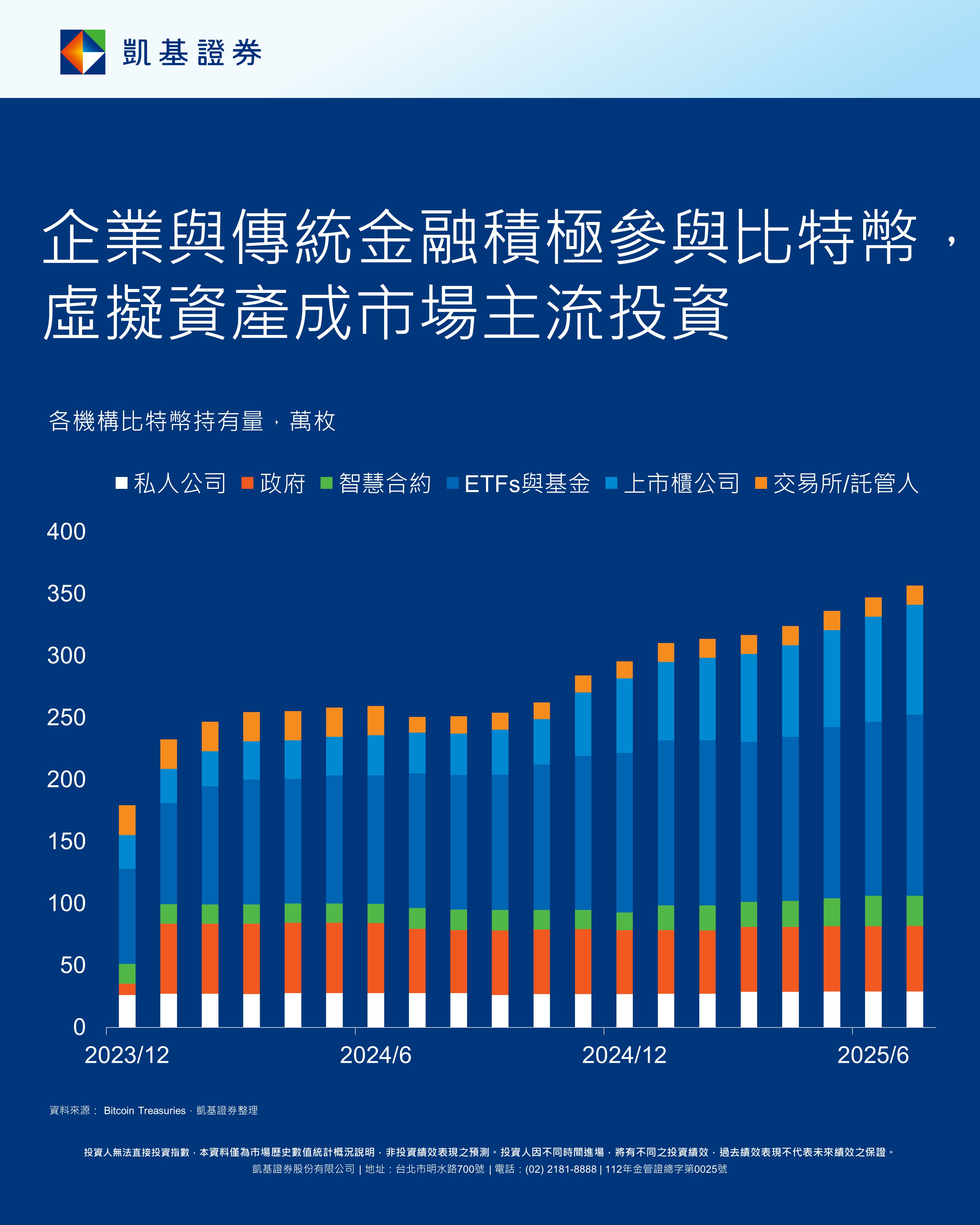 比特幣具有稀缺性,2024年底已有近2,000萬枚比特幣被開採,根據Bitcoin Treasuries統計,截至2025年7月20日政府與機構法人已持有超過357萬枚比特幣,今年以來增持最快速的兩大主體為「ETFs與基金」與「上市櫃公司」,前者從年初的128萬枚成長至141萬枚,增持10%;後者則從60萬枚成長至85萬枚,大幅增加42%。顯示其價值儲藏功能已被市場接受,企業與個人接受將加密貨幣視為資產主流投資工具的趨勢已成型。