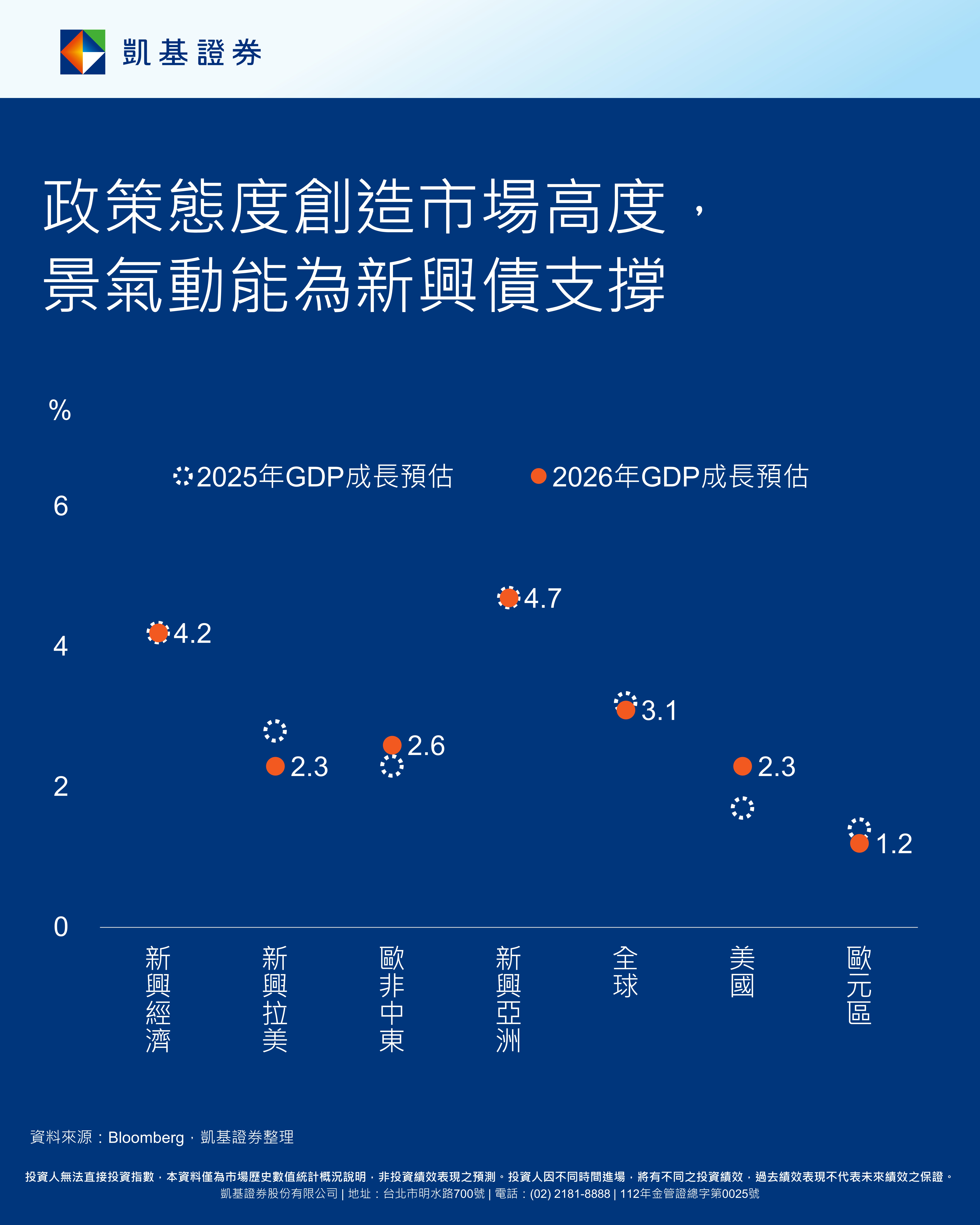 彭博預估2026全球經濟成長將維持3.1%水準,主要成熟國家如美國、歐元區GDP約落在2.3%與1.2%,而以印度、中國與南韓為首的新興亞洲,經濟預估成長分別達7.2%、4.5%與2.0%,預估全球經濟主要成長動能仍由新興國家所帶動。隨關稅不確定性降溫,各國通膨有望逐漸改善,部分新興國家存在降息機會,並在中國、印度與墨西哥等國家擴大財政支出政策挹注下,有望支持新興國家經濟動能續航。