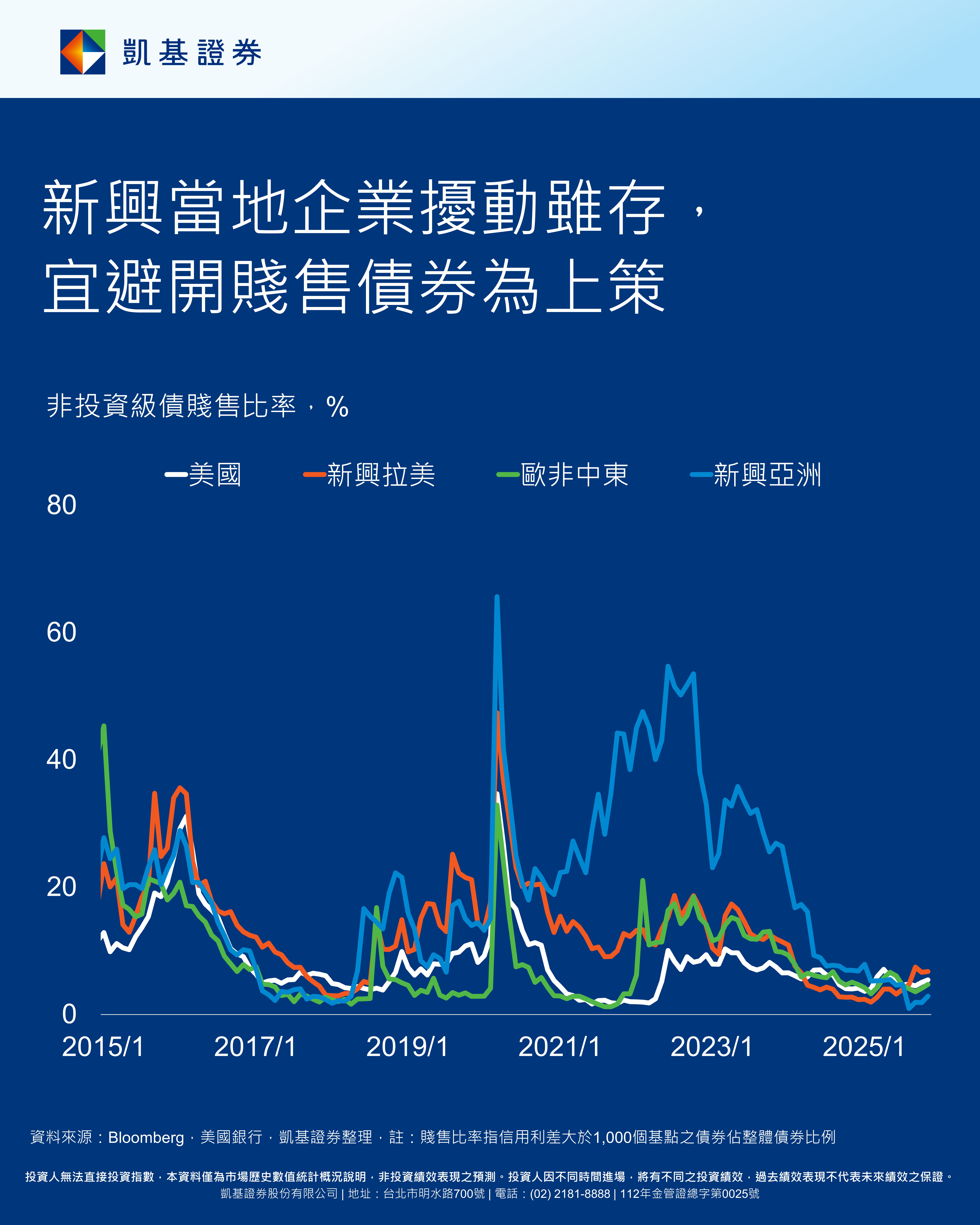 新興市場受特定企業違約影響,2025年當地企業違約率緩步走升,僅新興亞洲企業下行,另2025年至今新興市場企業債賤售比率亦呈走升,機構法人預估2026年企業違約率將升至2.7%。考量中國、泰國、匈牙利、墨西哥、哥倫比亞和巴拿馬主權信評均存在負面展望,欲配置新興債者,宜避開前述國家及低信評的非投資等級債,降低國家主權信評調降可能性,與連帶導致相關企業遭降評之風險。