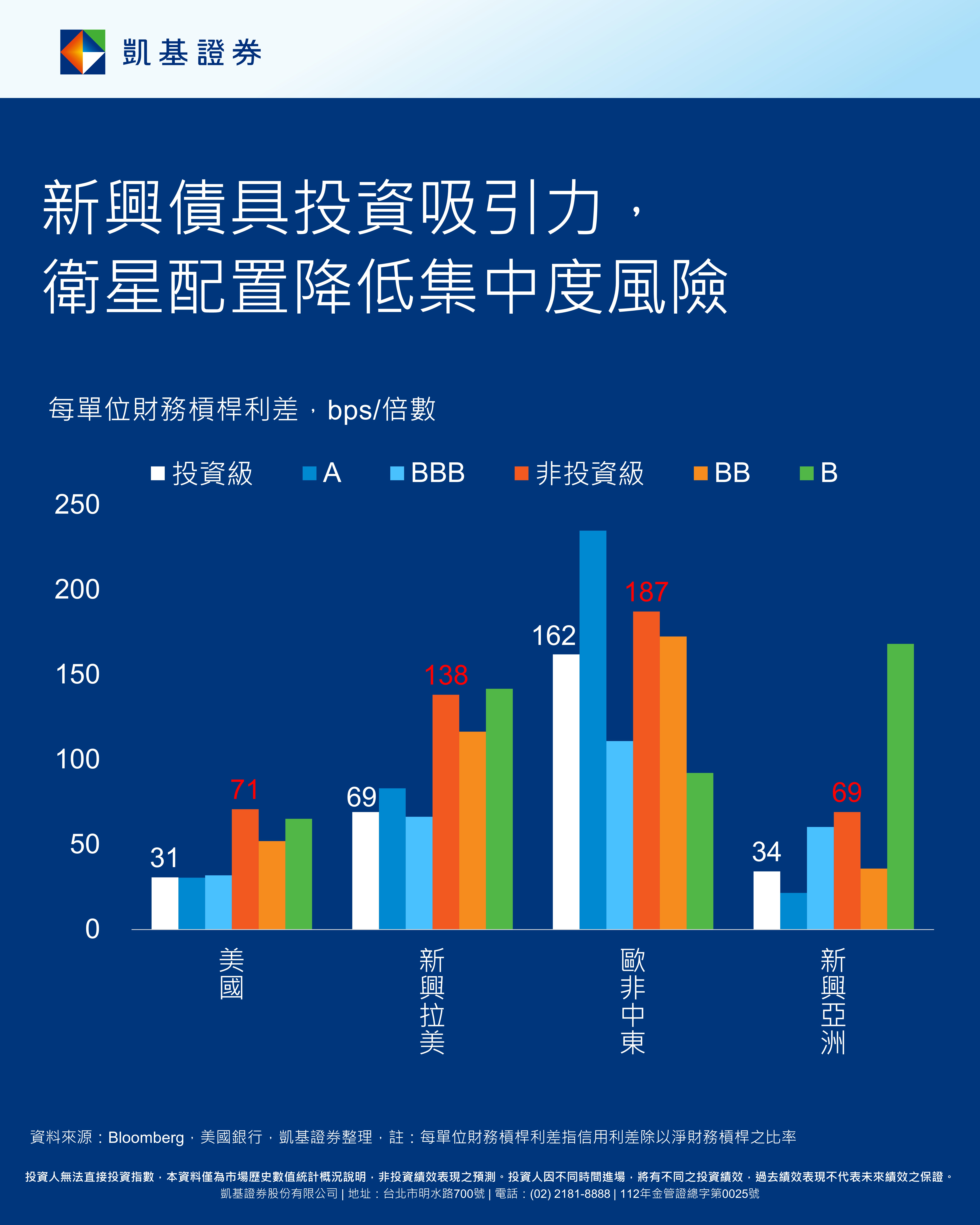 儘管關稅與貿易戰和利率波動,對部分新興國家企業造成衝擊,但多數新興企業信用利差仍收斂至歷史低位,主因來自企業獲利持續增長,多數新興國家與企業更加注重去槓桿化,從每單位淨財務槓桿利差比率來看,不論是投資級或非投資級債,新興國家企業均高於美國企業且具相對投資吸引力。考量新興國家財政赤字擴張可能加劇公債發行需求與利率波動升溫,新興企業債宜首選投資等級並透過分散配置,降低財政紀律擾動並避免過度集中單一國家風險。