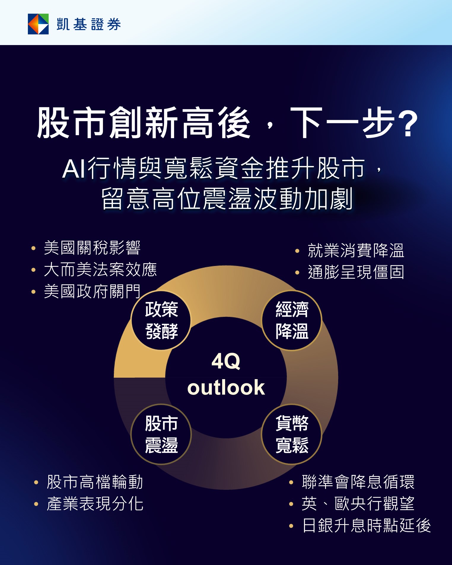 另一方面,股市來到歷史高點,估值過高、評價面臨修正,預期股債匯在第四季將波動不減。