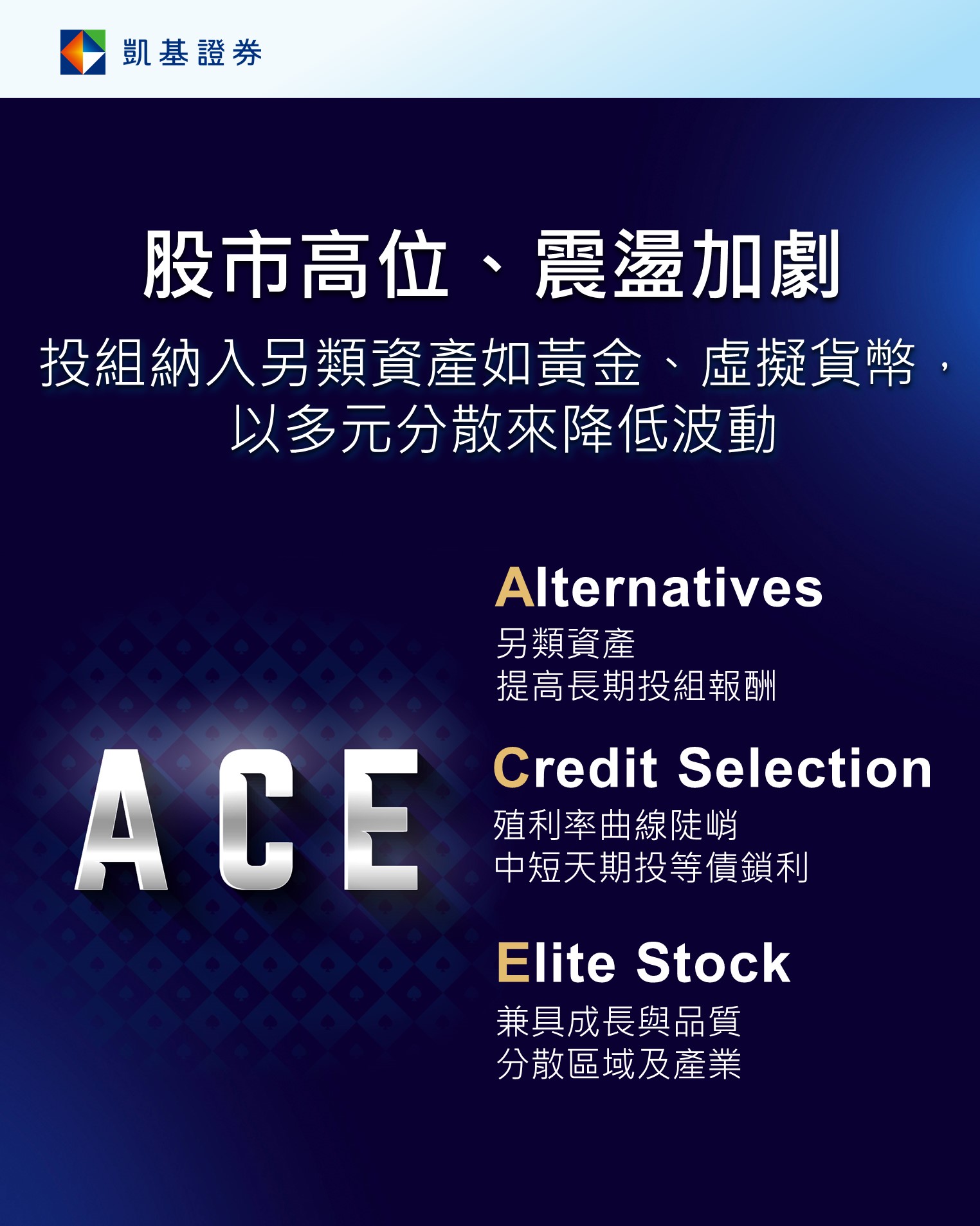 股市乖離率過高,加上景氣放緩,第四季資產配置以多元化較佳,宜採取A(另類資產Alternatives)、C(固定收益Credit Selection)、E(優質股權Elite Stock)搭配策略作為投資主軸,做好分散風險、降低波動的再平衡調整,才能在震盪中穩健茁壯資產部位。