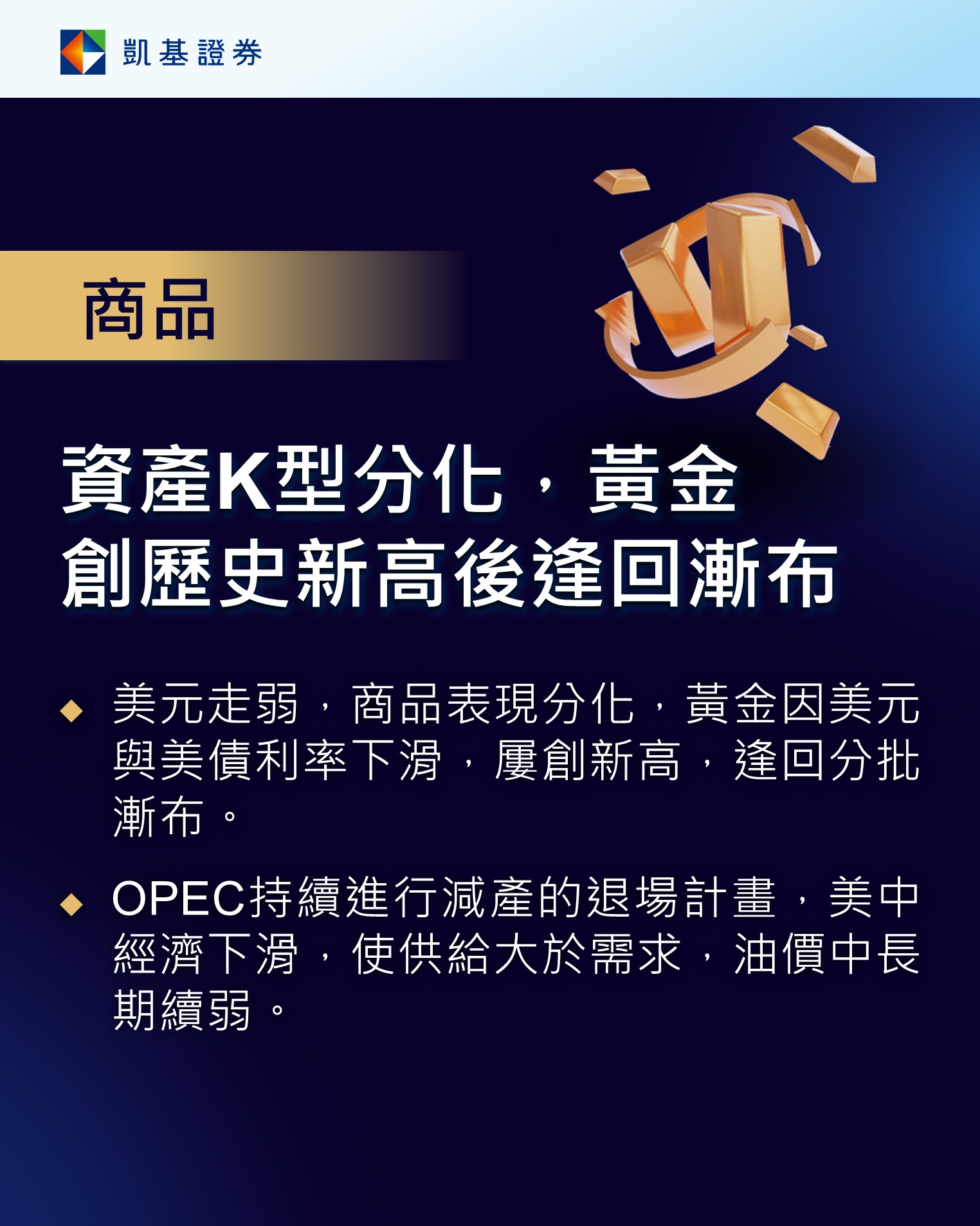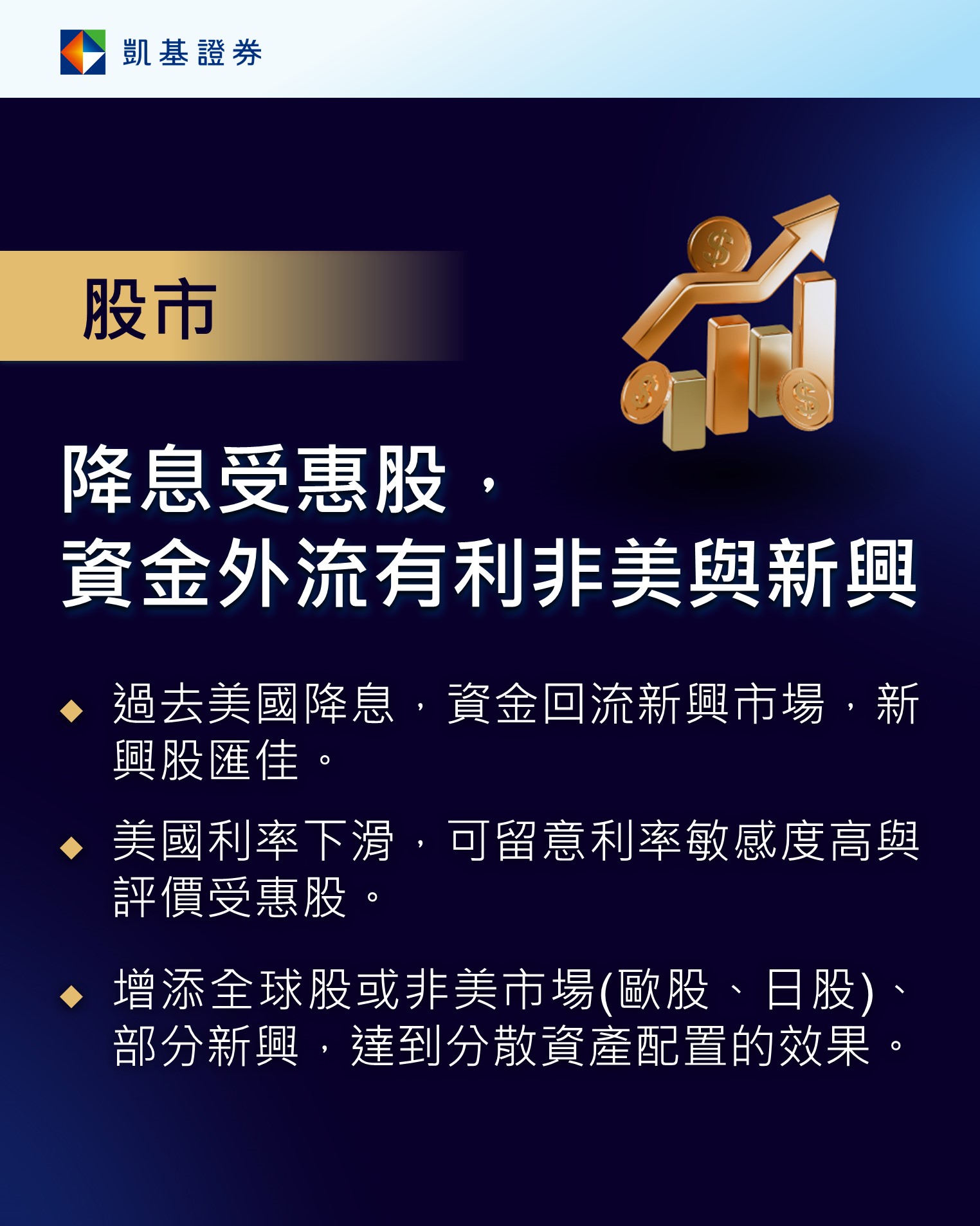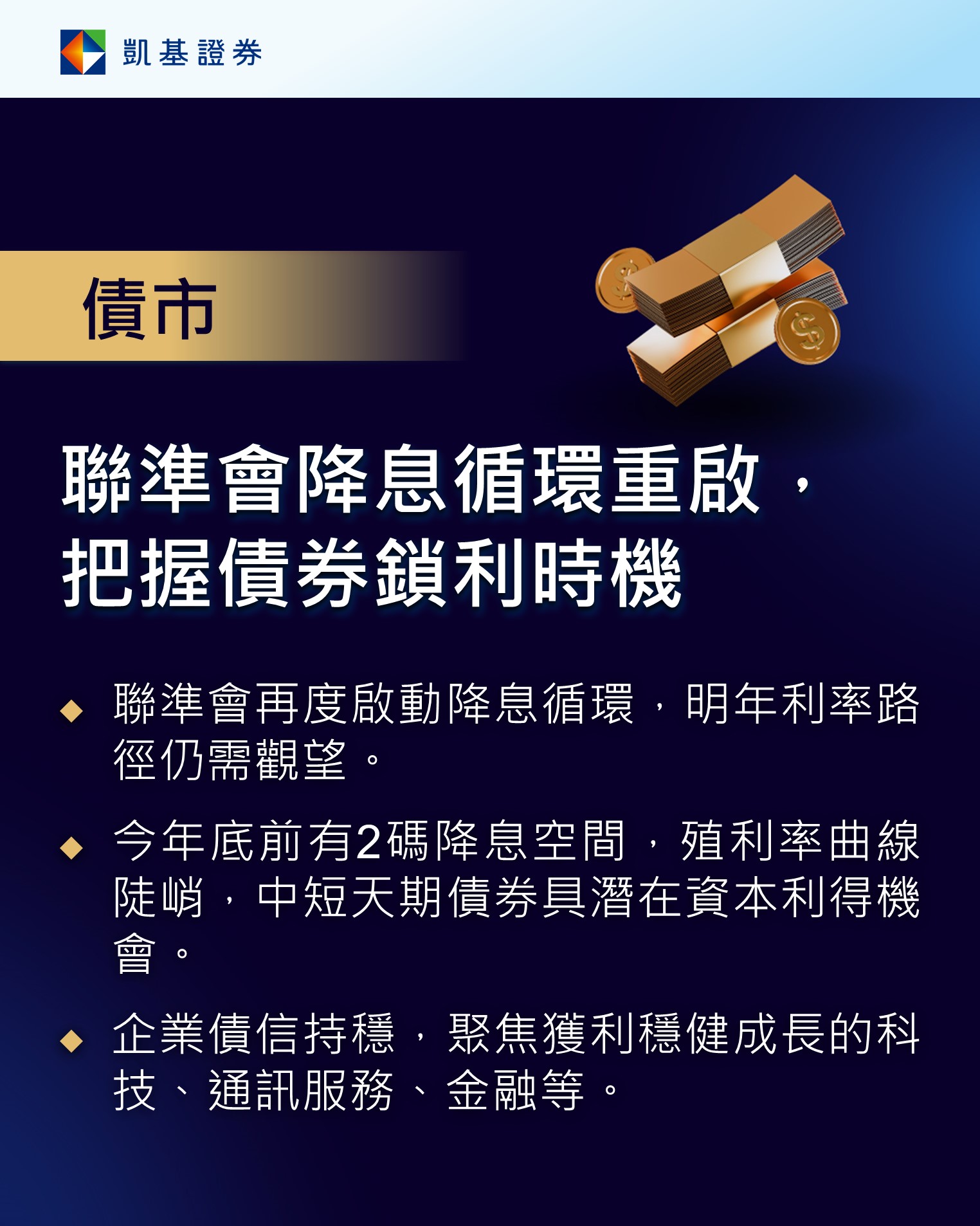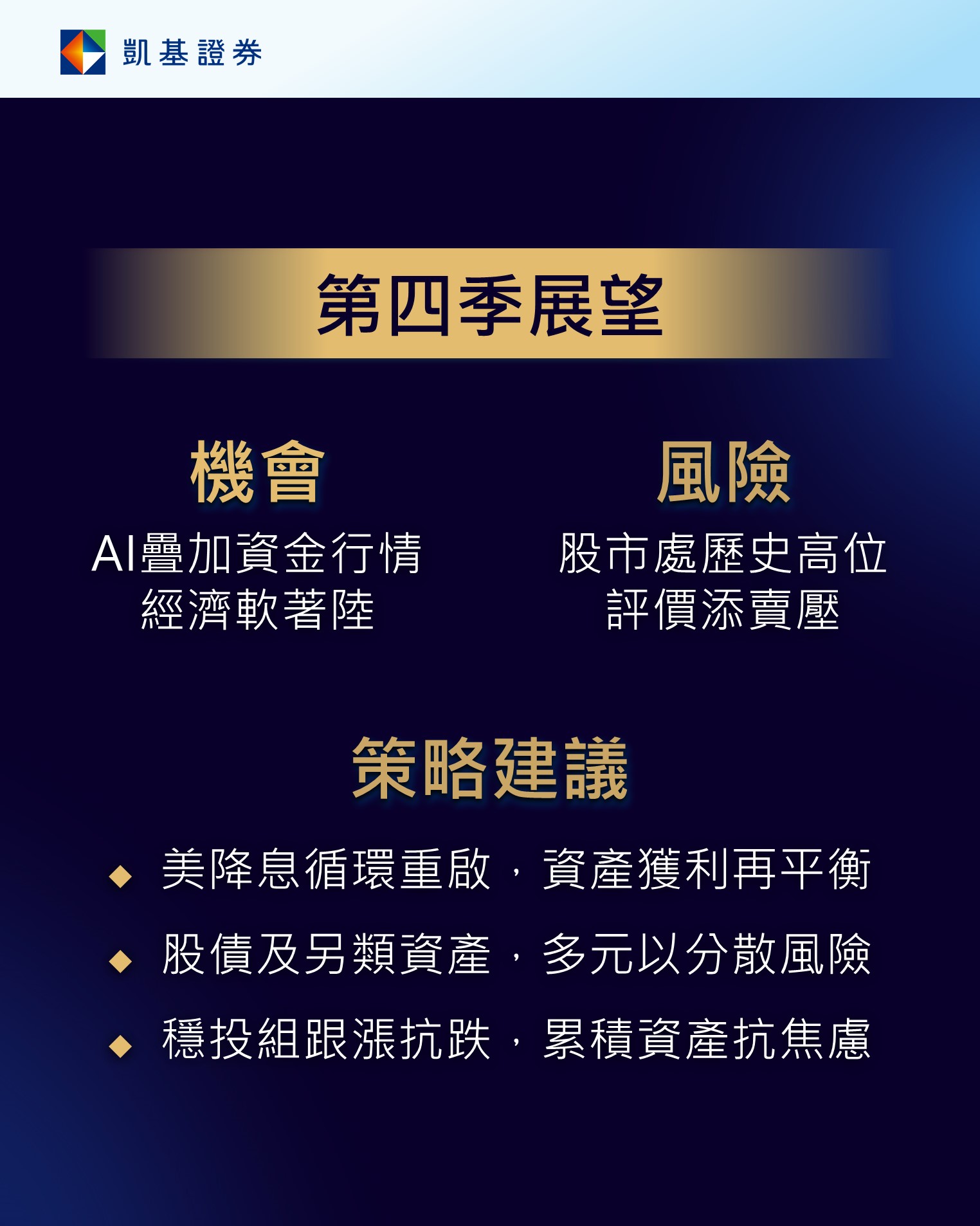 AI需求旺盛,企業獲利仍佳,推升美股續創歷史新高。類股出現輪動現象,美國公債殖利率因降息呈現下滑,對利率敏感度較高的族群,包括像地產、金礦、金融股,甚至小型股等,短期可望因降息而受惠。然而,整體股市已來到高位、估值偏貴,回調風險漸增,添未來波動。