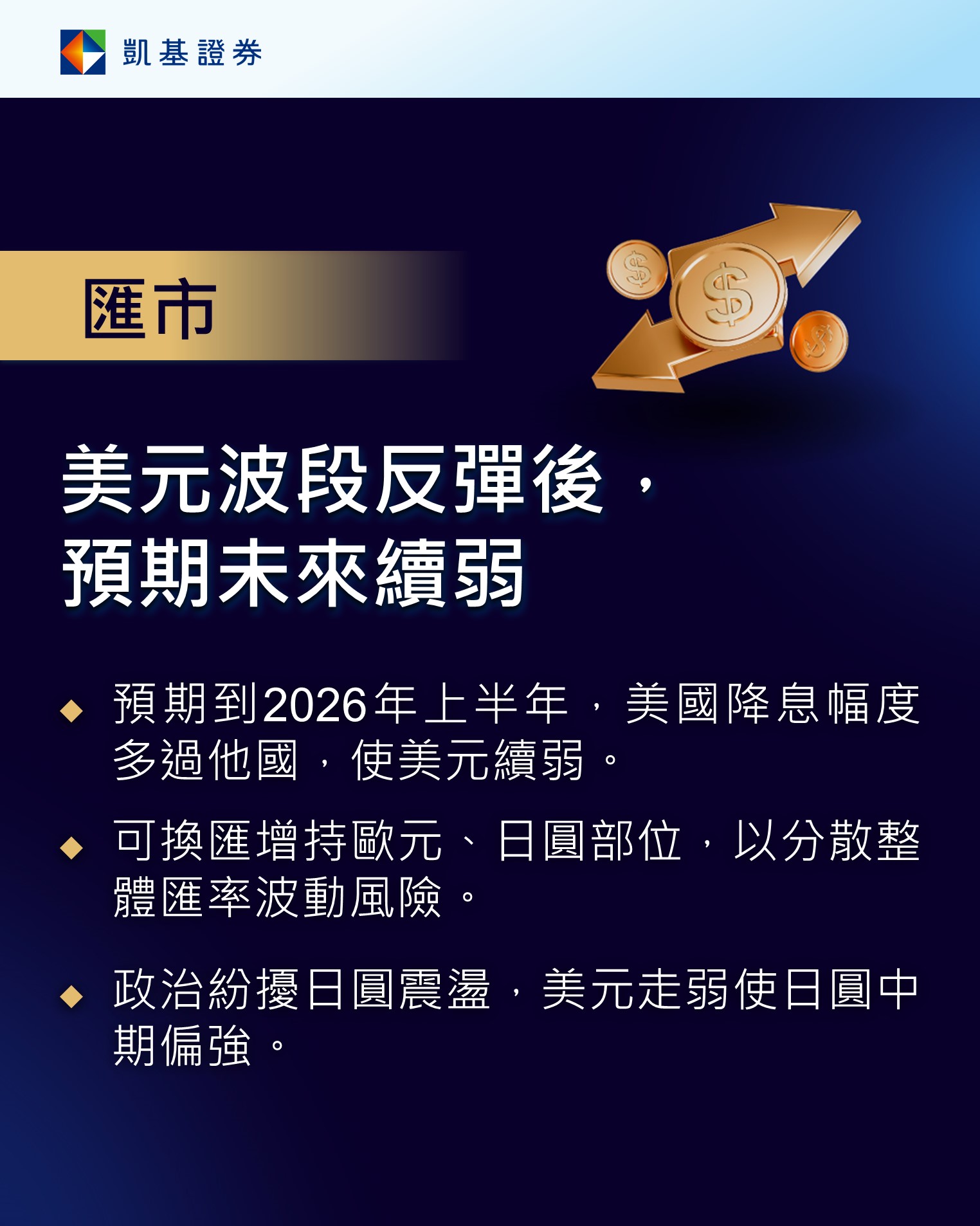 美國降息、美元走弱,資金外流至非美與新興股,推動歐股、日股與部分新興股上漲。日股短期雖因政治紛擾,與央行減持資產而有震盪,但經濟改善、薪資成長,日本內需仍可作為分散投資的選項之一。美國公債殖利率曲線下移,推升債市上漲,投資級債甚至新興債各有表現。