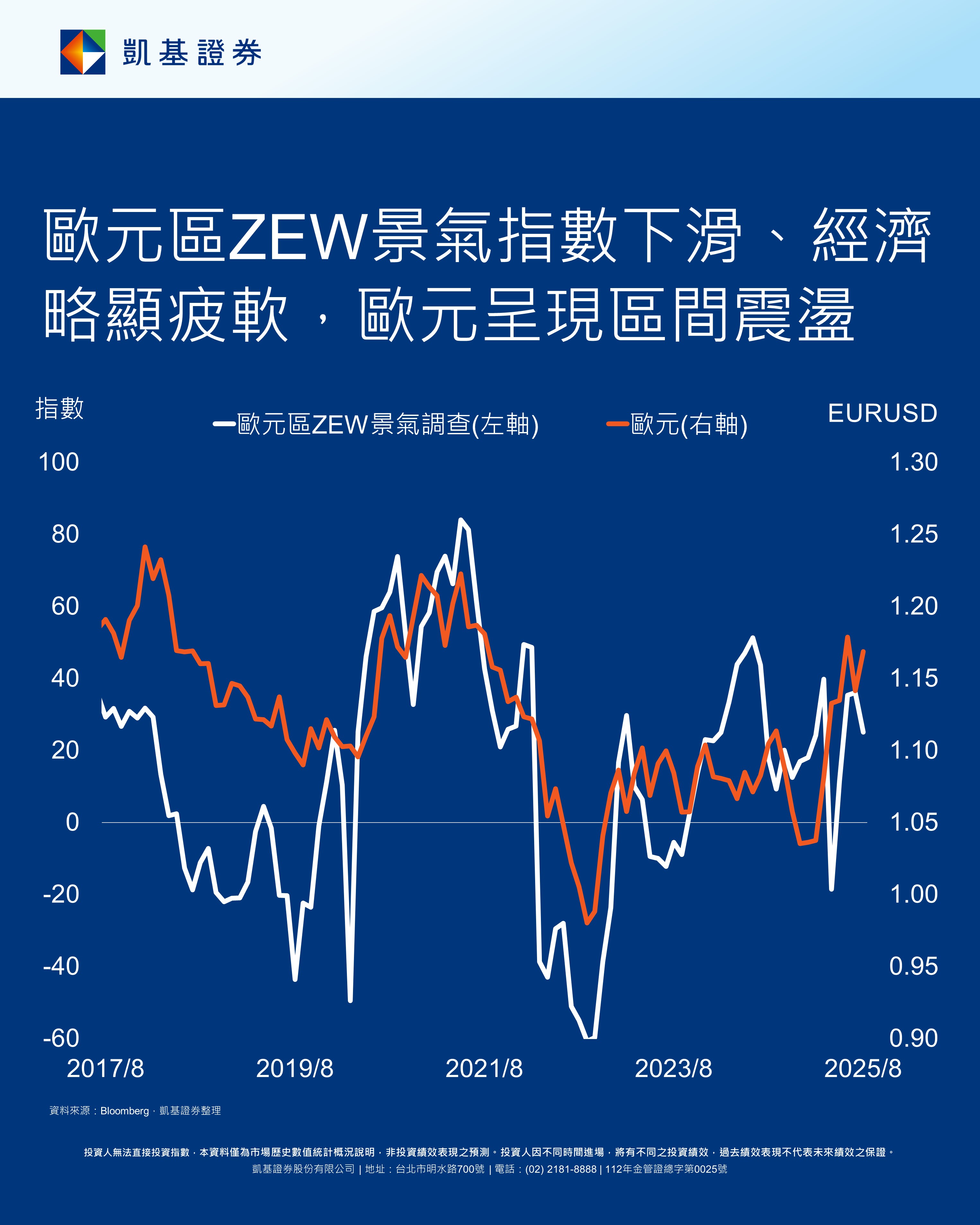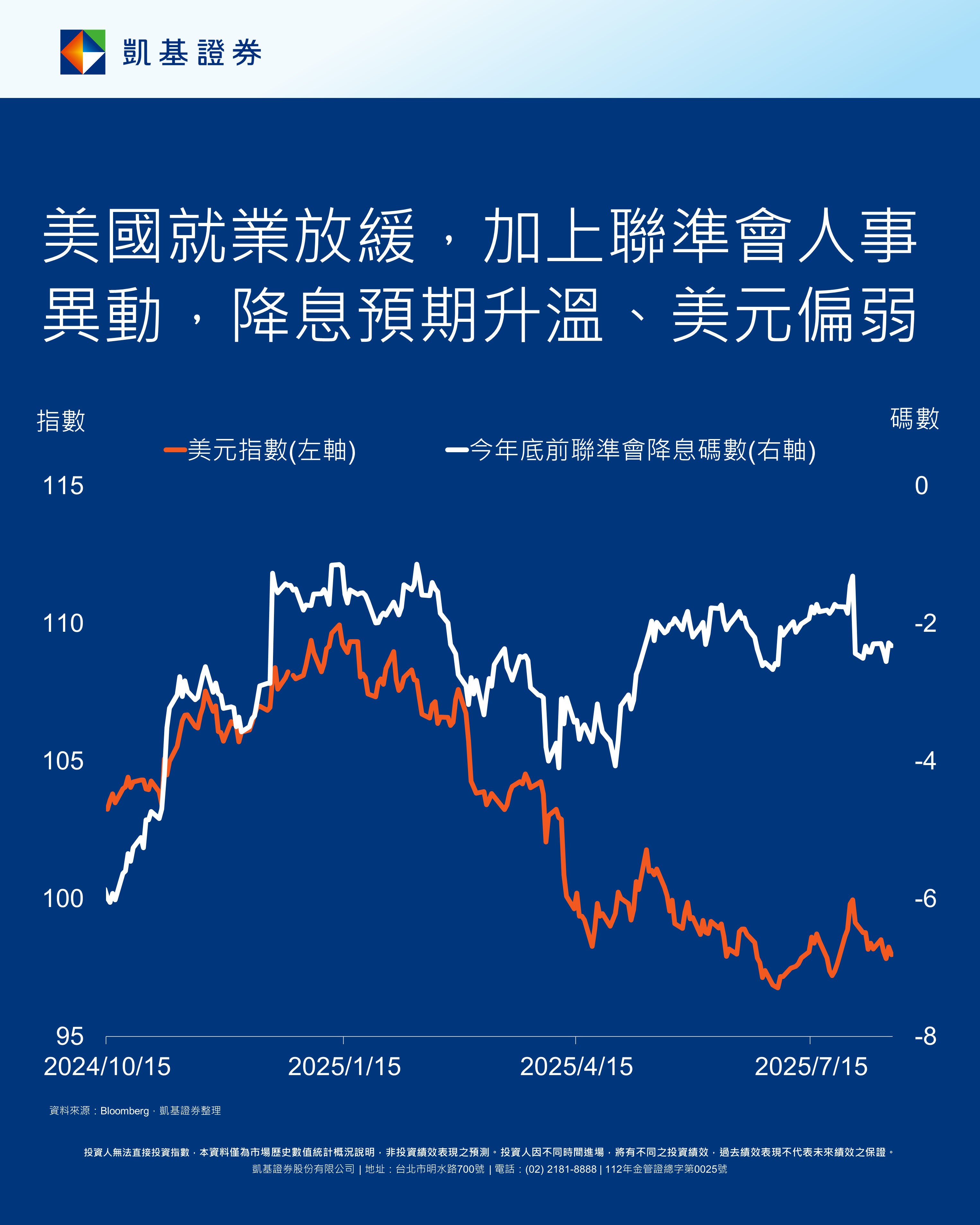 美國7月、8月新增非農就業人數皆大幅下滑,且不如預期,就業增長明顯放緩、失業率上升以及薪資增幅轉弱,說明勞動市場已有感降溫。此外,總統川普干預聯準會理事成員意圖明顯,聯準會偏鴿派傾斜,使9月降息機率升高,年底前降息幅度增加,美元指數偏貶值方向調整。