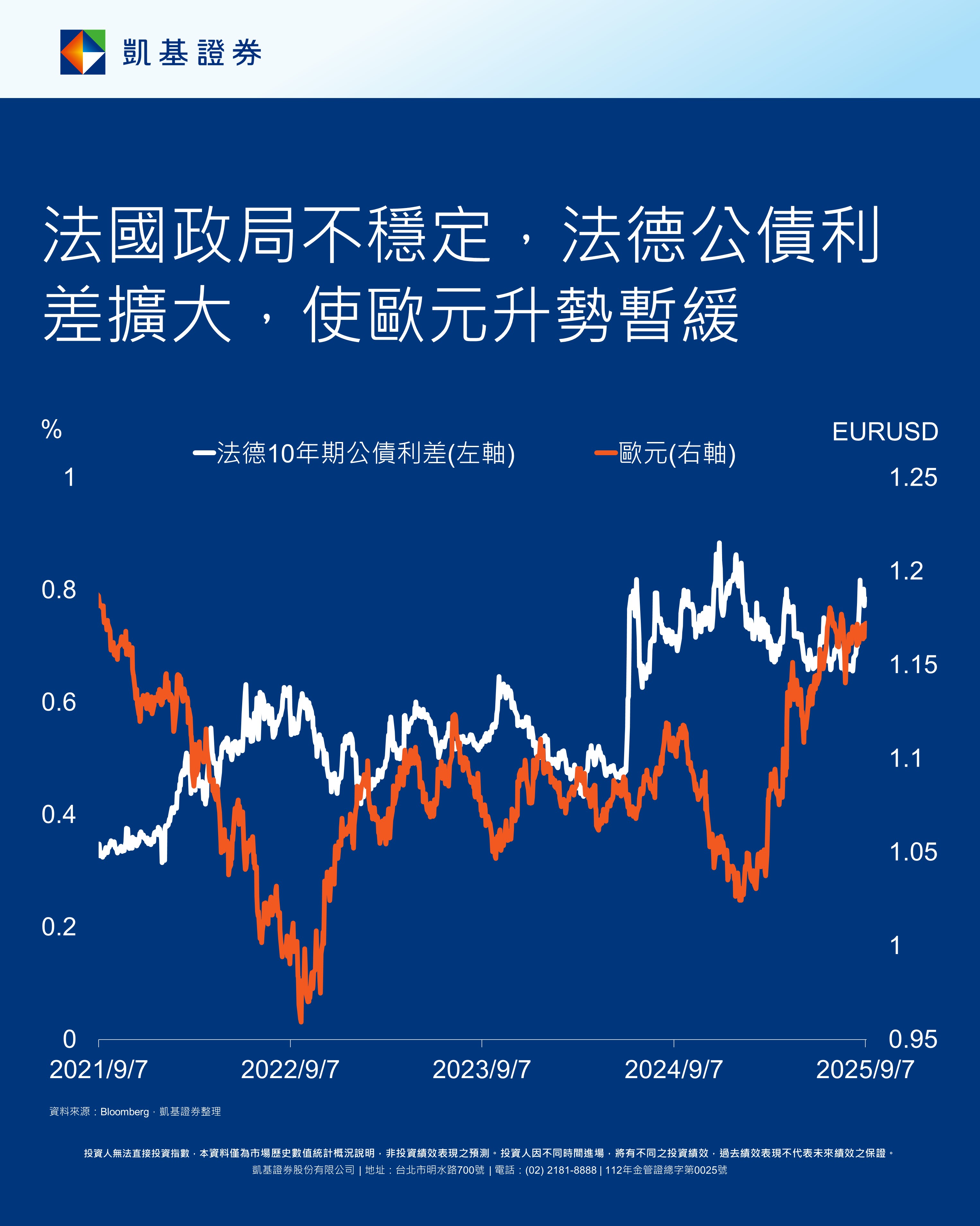 法國政府陷入預算僵局,總理倒閣的政治風險已顯現,增添財政前景惡化機率,使中長天期法國公債利率上揚,法德公債利差擴大。歐元區政治動盪,侷限歐元之前的強勢漲幅,然而考量法國總統仍將提名新總理,政治不確定性為短期影響,且德國擴張財政支出預算,可望於年底前通過,對歐元區景氣回溫有益,預期歐元長線偏緩步升值方向發展。